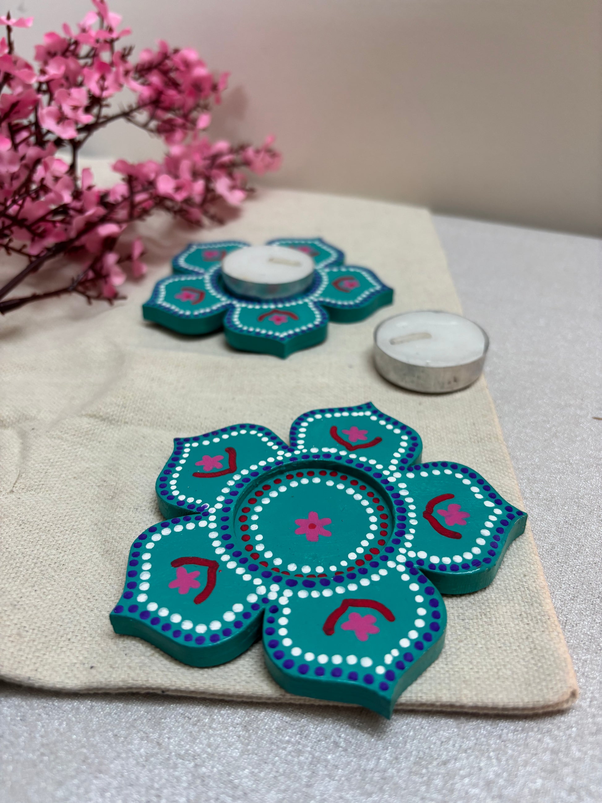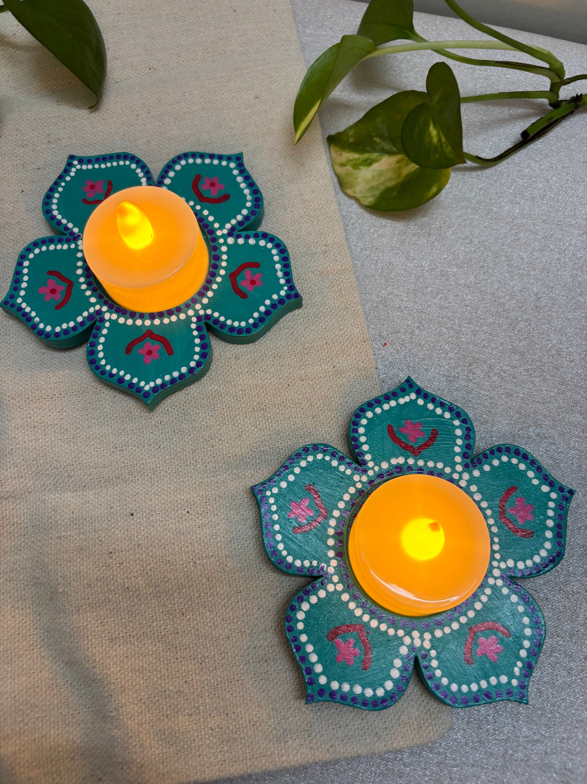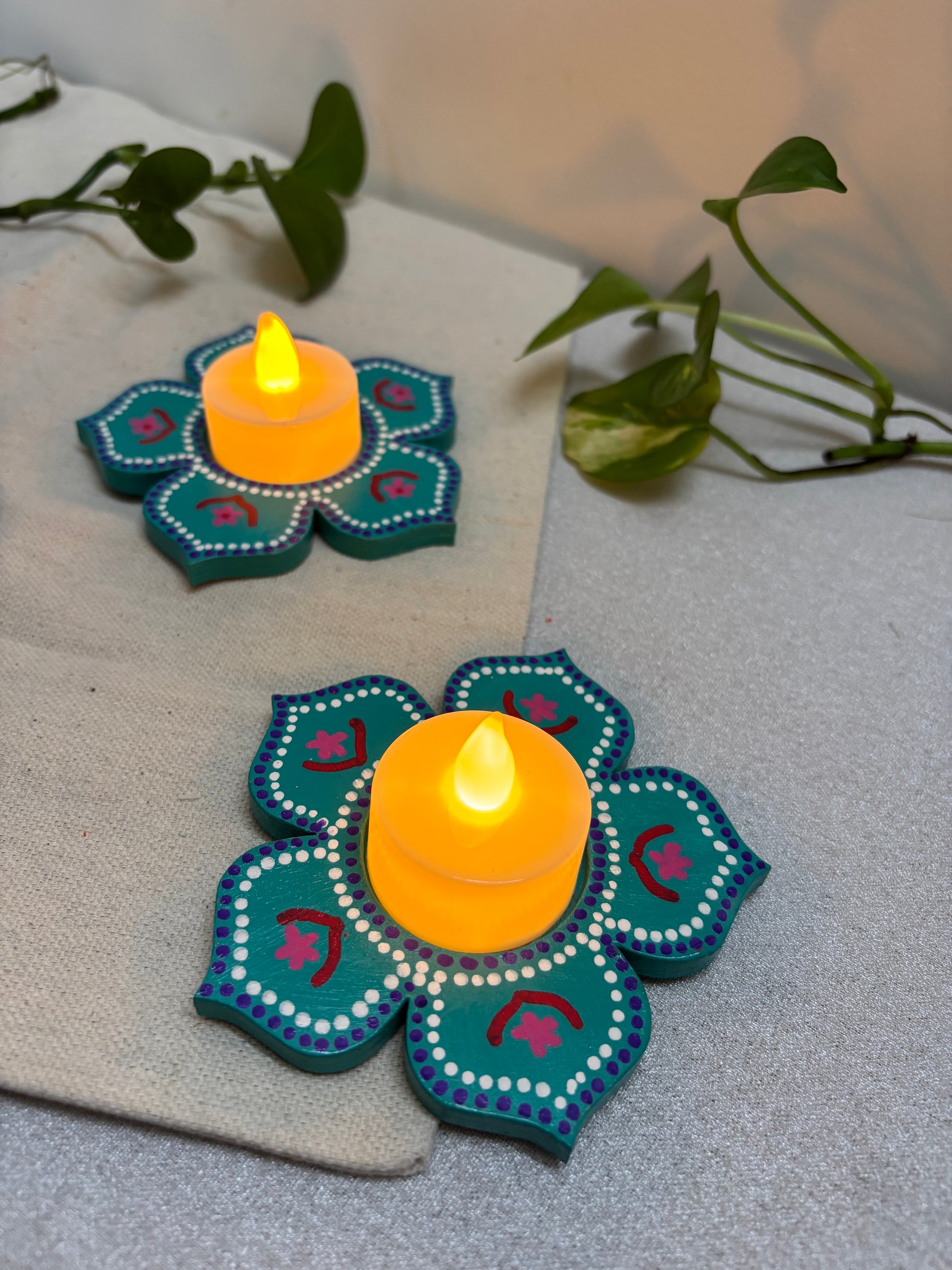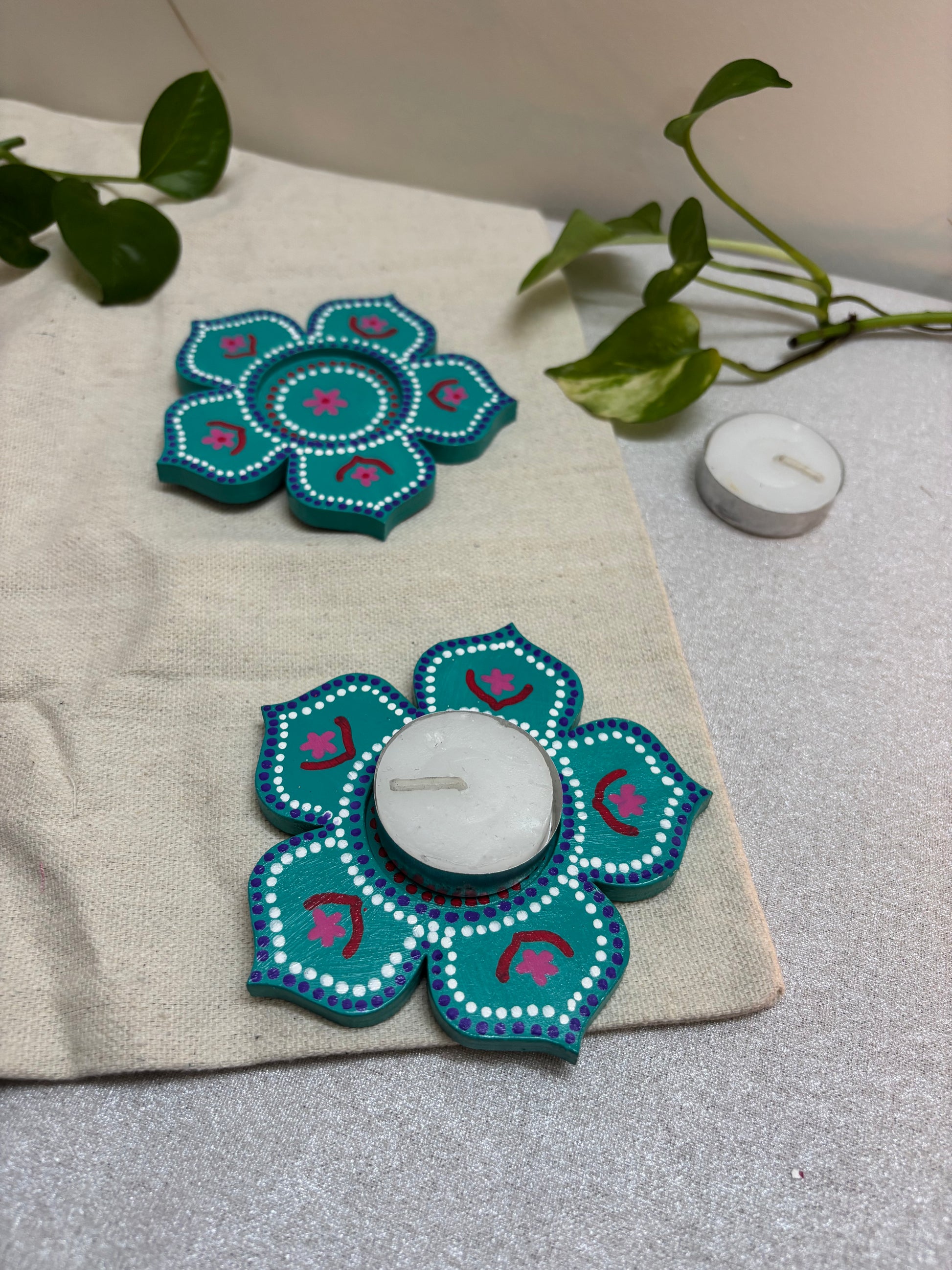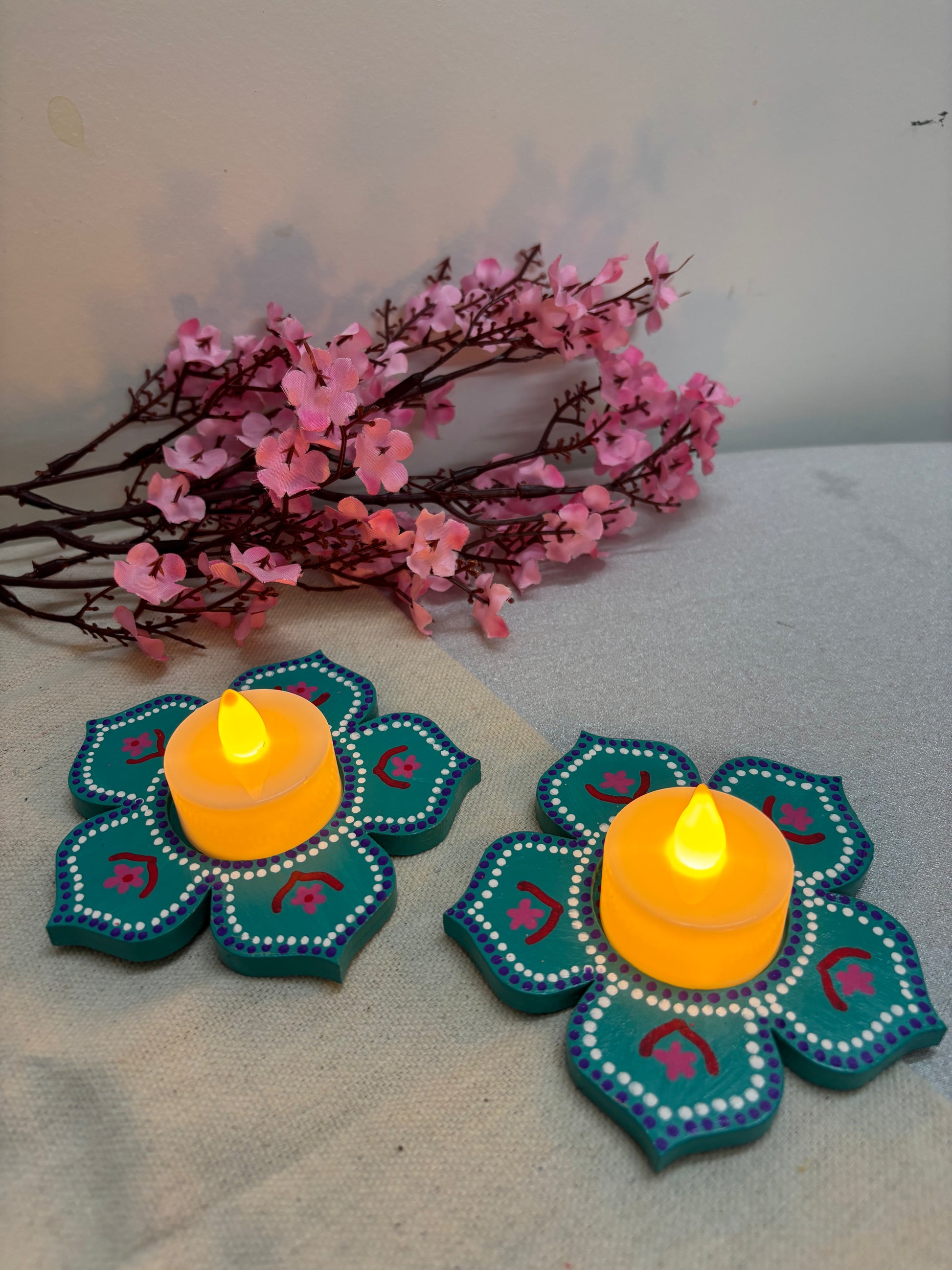 The Arvind Hand-Painted Tea Light Holders bring a vibrant yet soothing accent to your décor. Crafted in a blooming floral design, each holder is painted in teal color and deep pink with intricate detailing, giving it a festive charm. The bright tones and petal-shaped form make Arvind a perfect center piece - ideal for Diwali décor, pooja setups, dinner tables, or as heartfelt gifts.