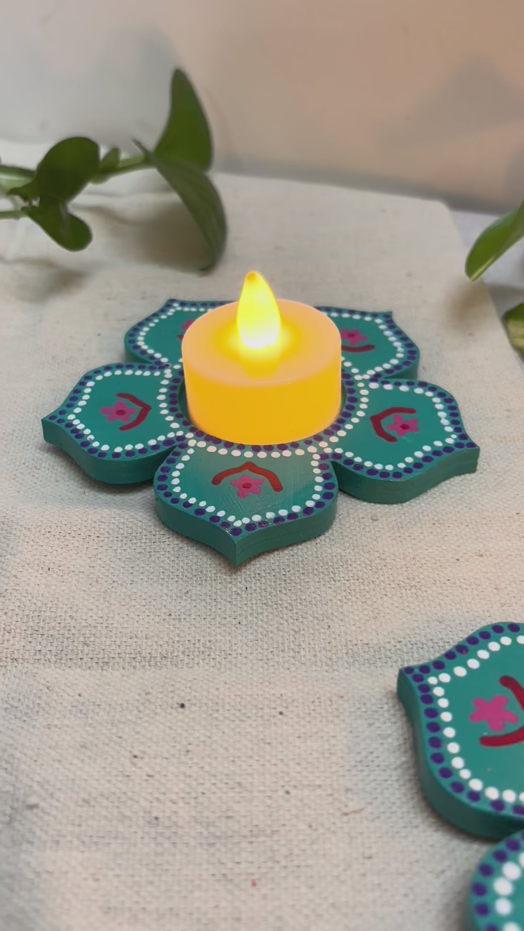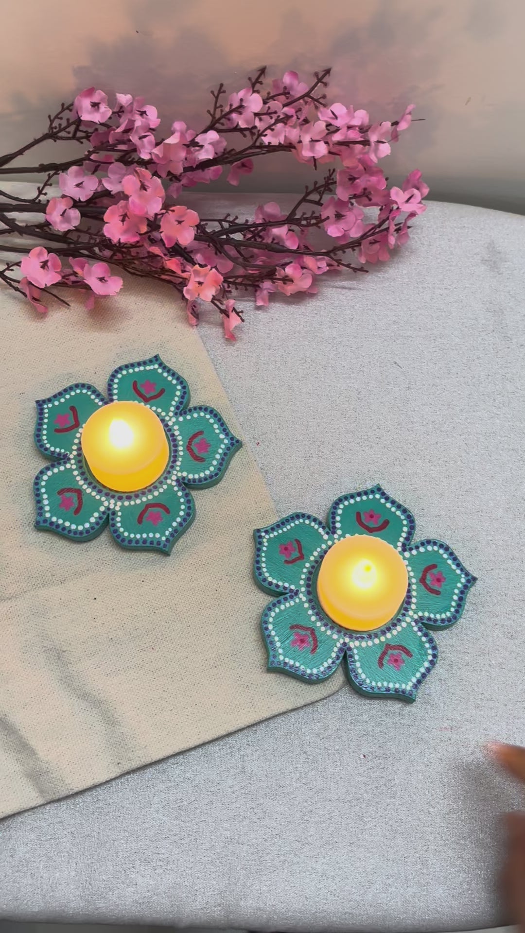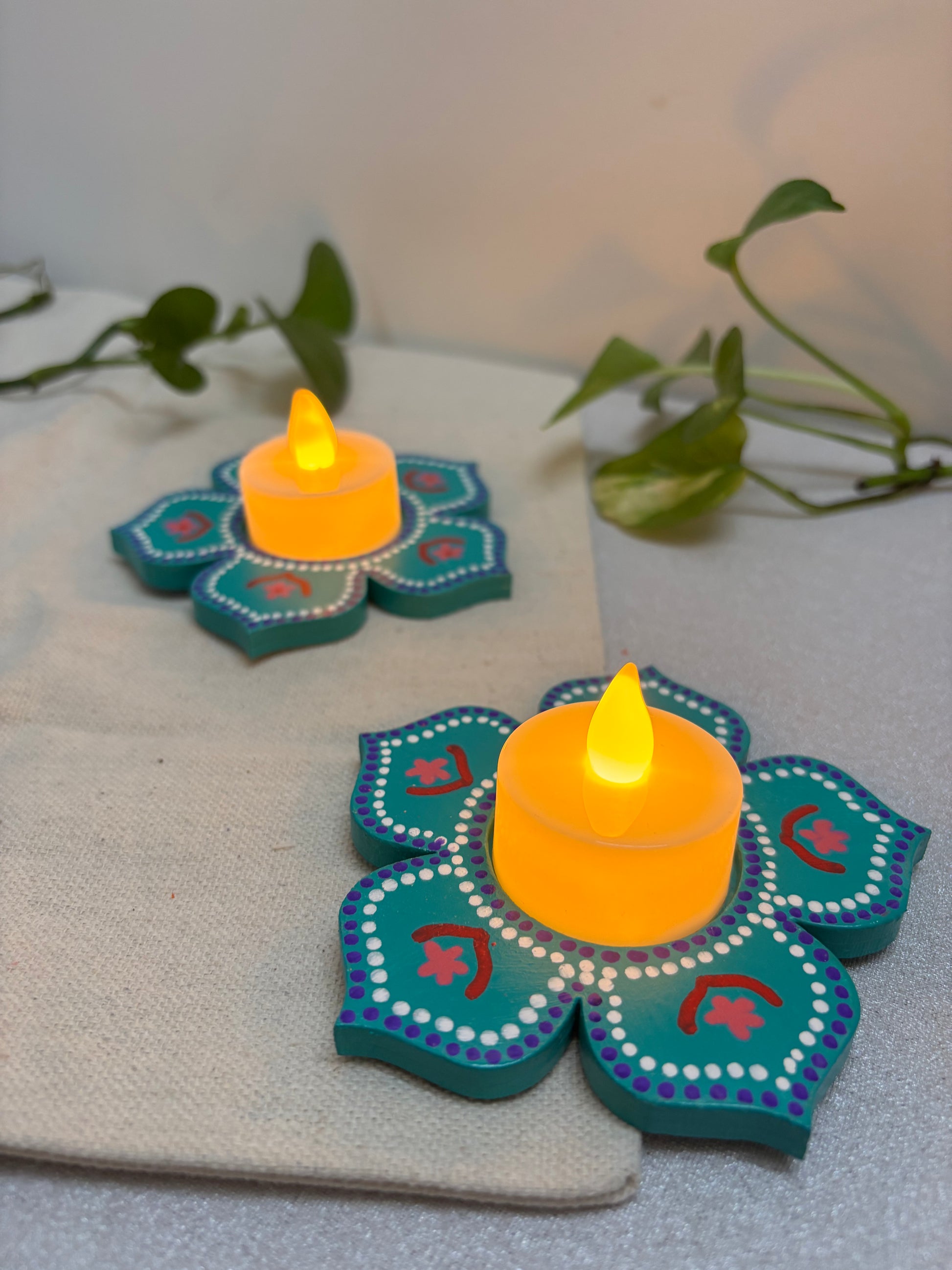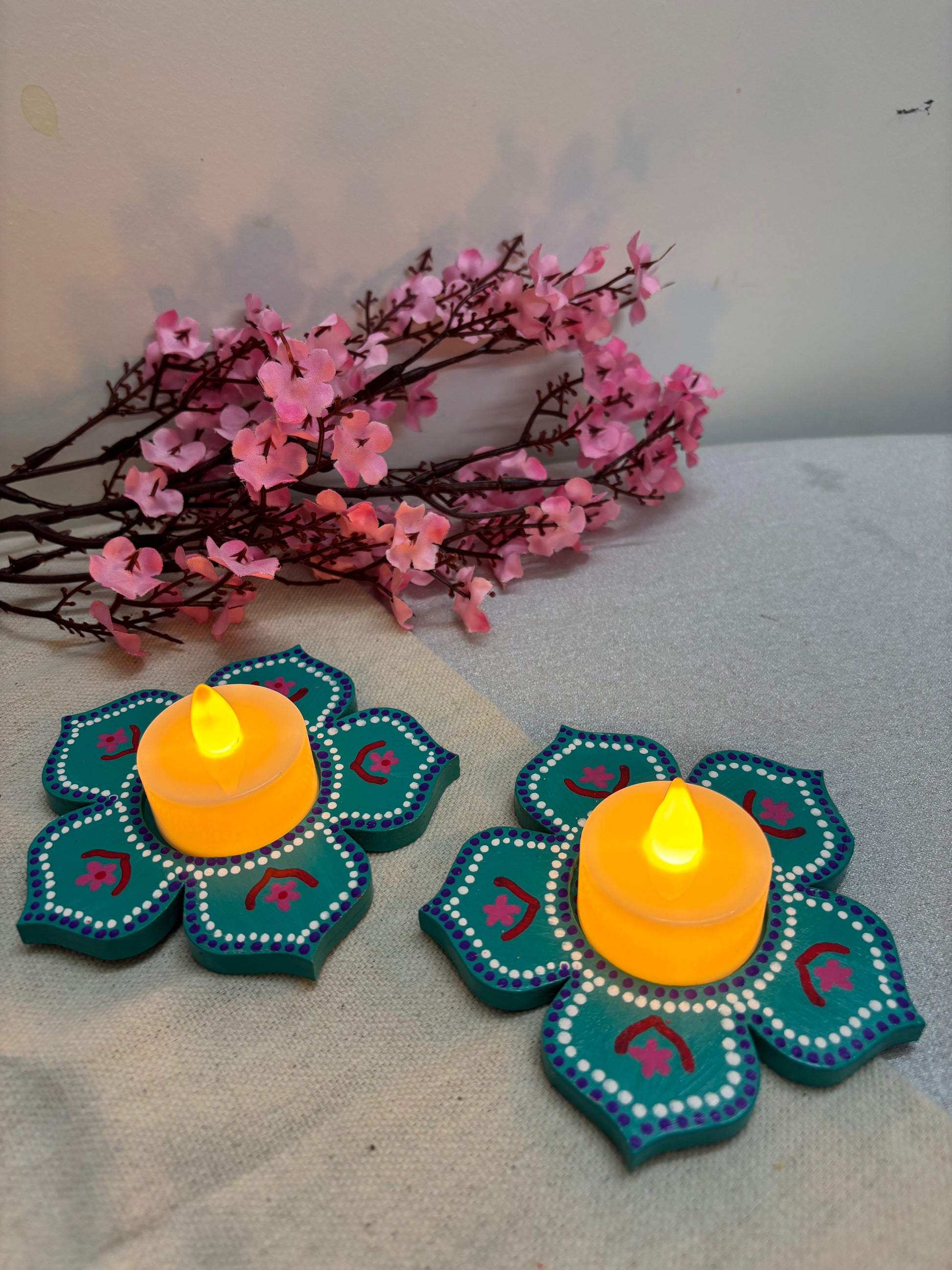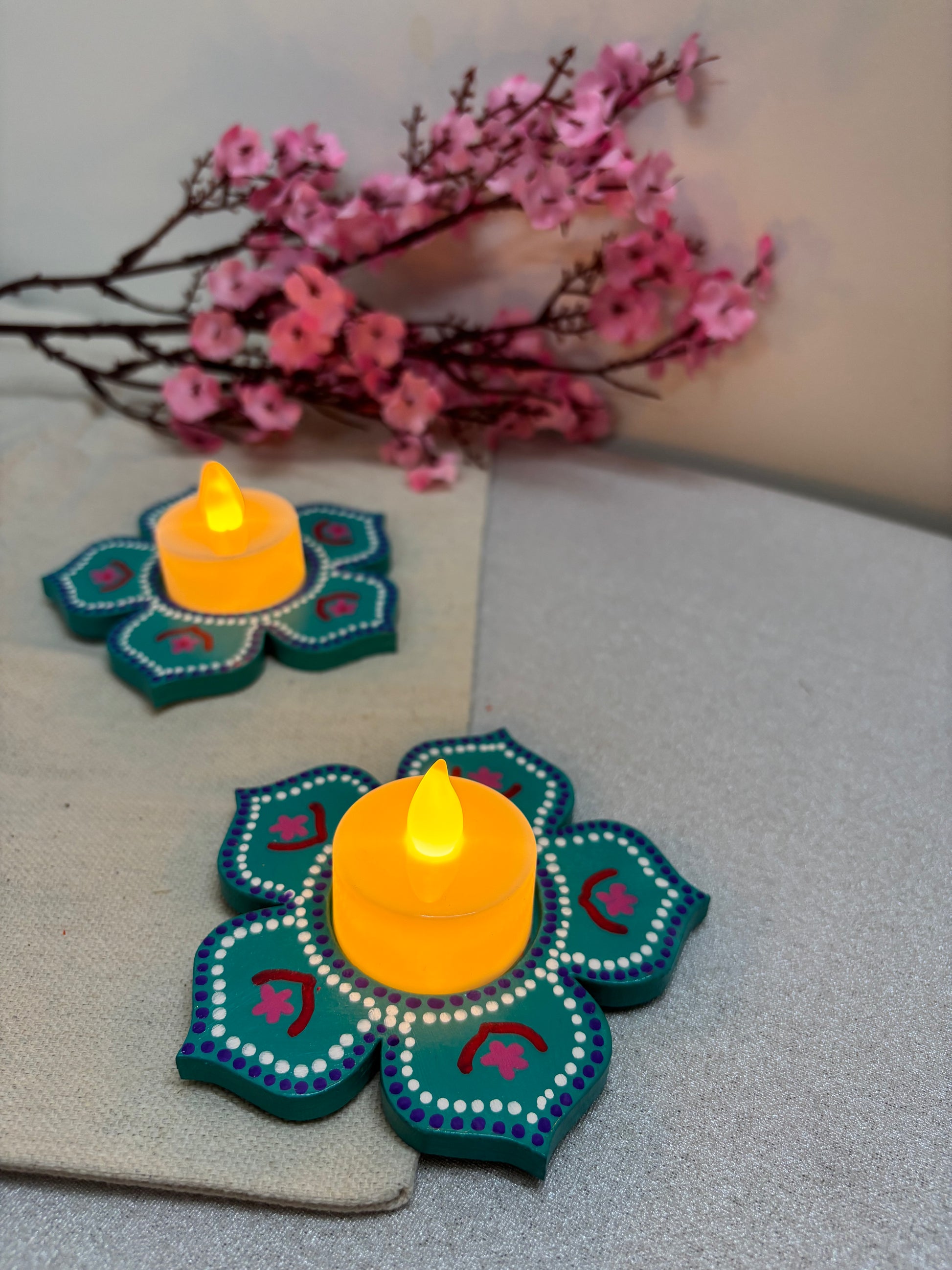 The Arvind Hand-Painted Tea Light Holders bring a vibrant yet soothing accent to your décor. Crafted in a blooming floral design, each holder is painted in teal color and deep pink with intricate detailing, giving it a festive charm. The bright tones and petal-shaped form make Arvind a perfect center piece - ideal for Diwali décor, pooja setups, dinner tables, or as heartfelt gifts.