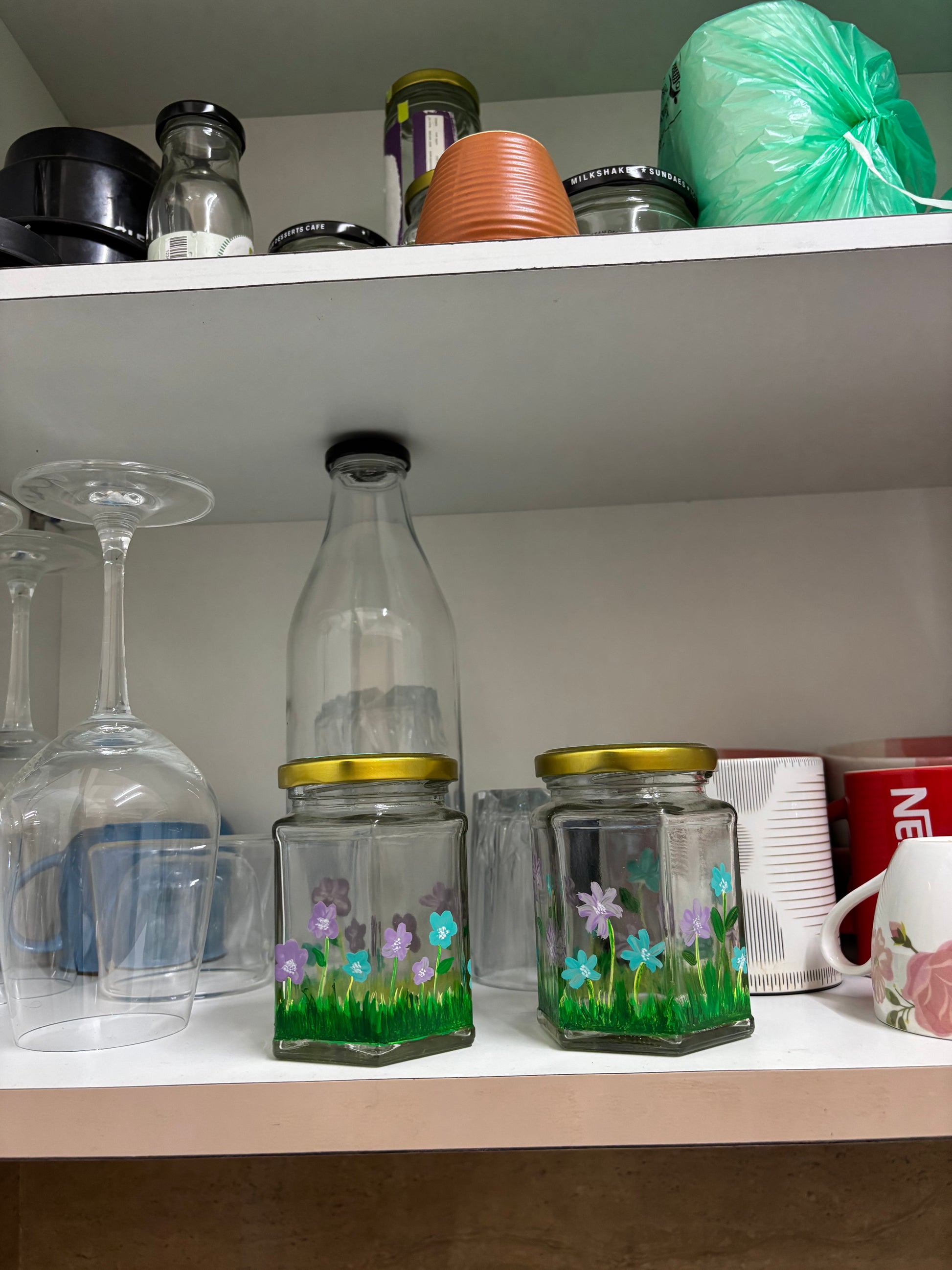 This glass jar is hand-painted with blue and purple wildflowers, each brushstroke capturing a moment of stillness in nature.