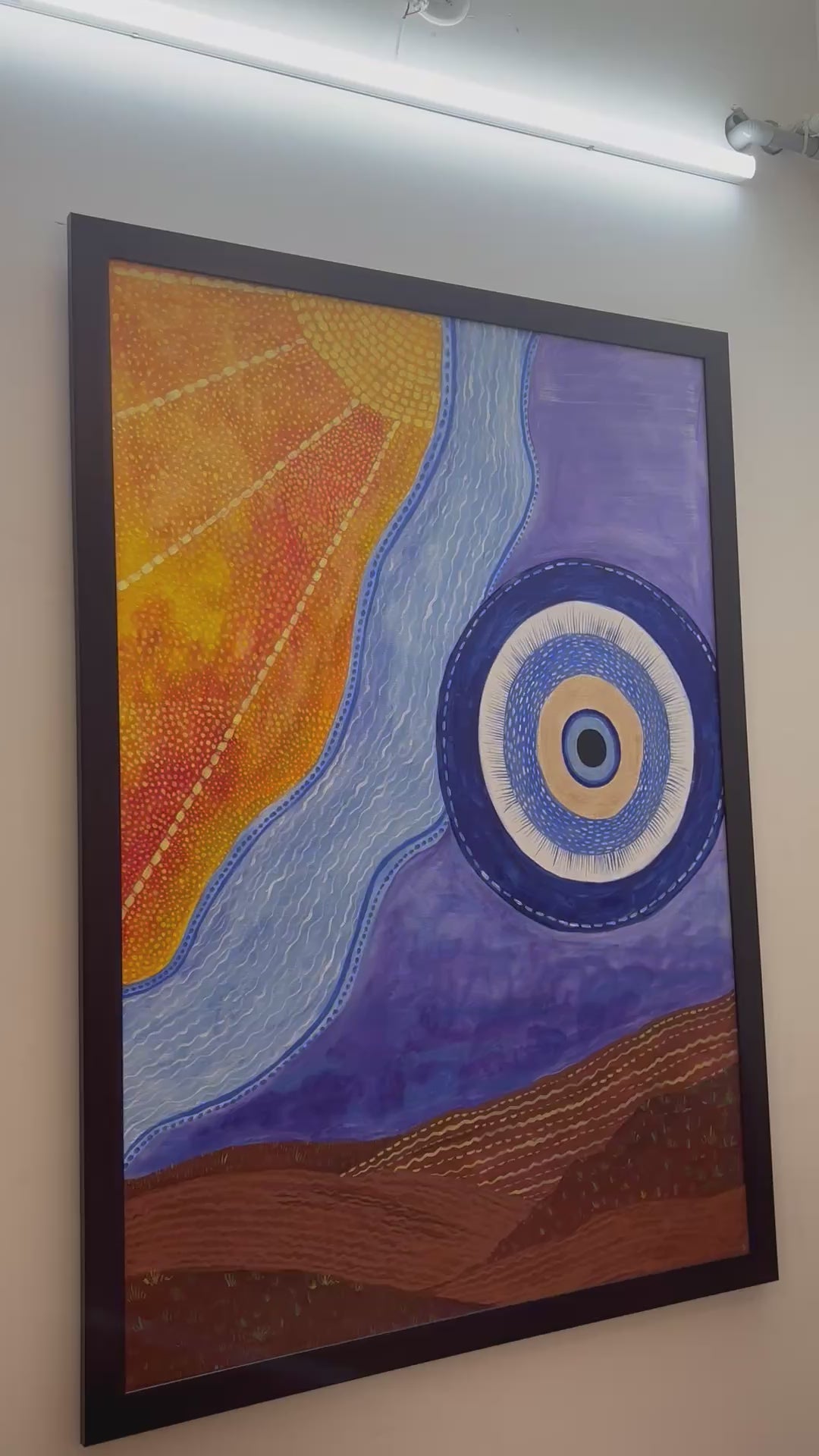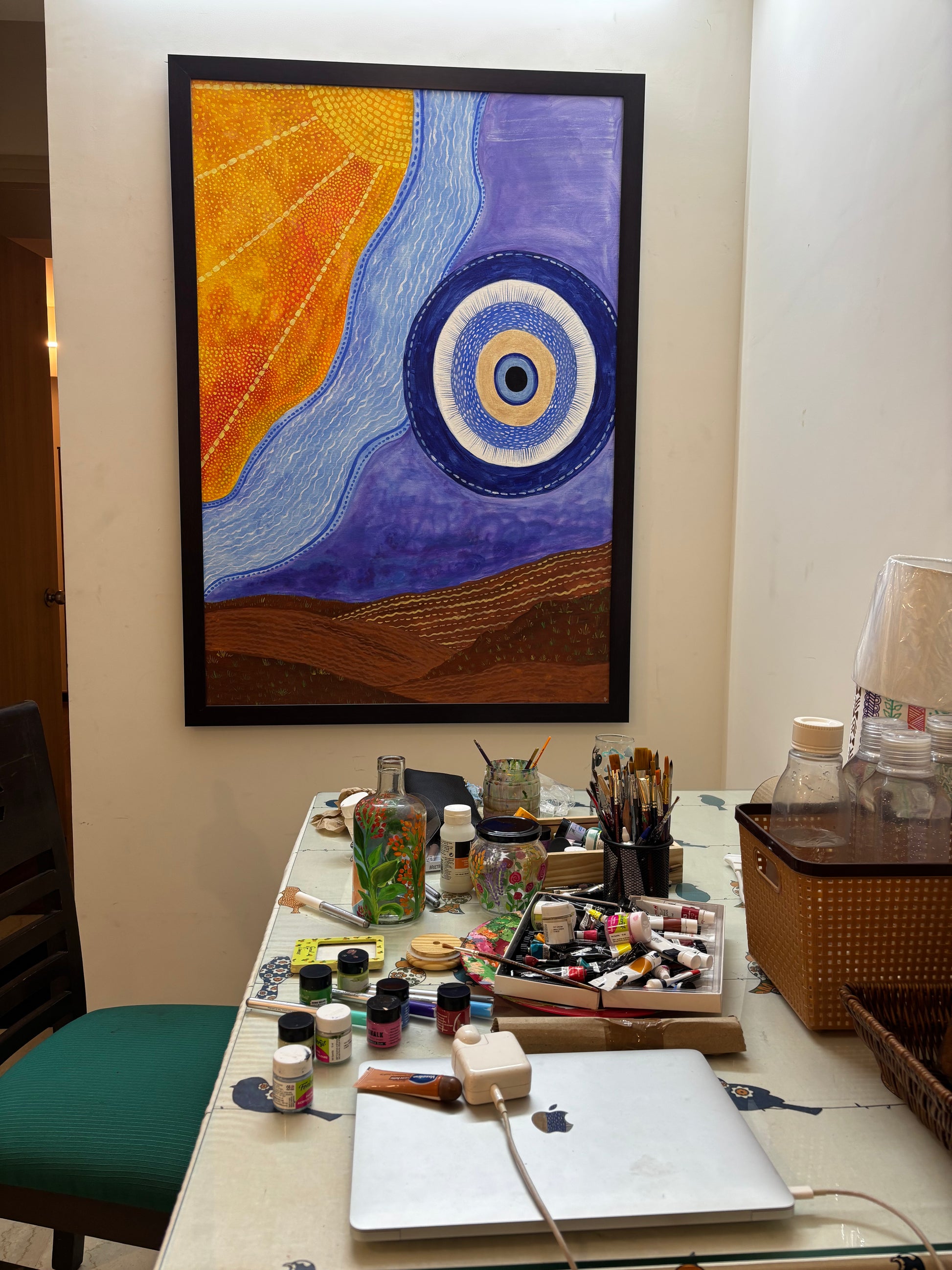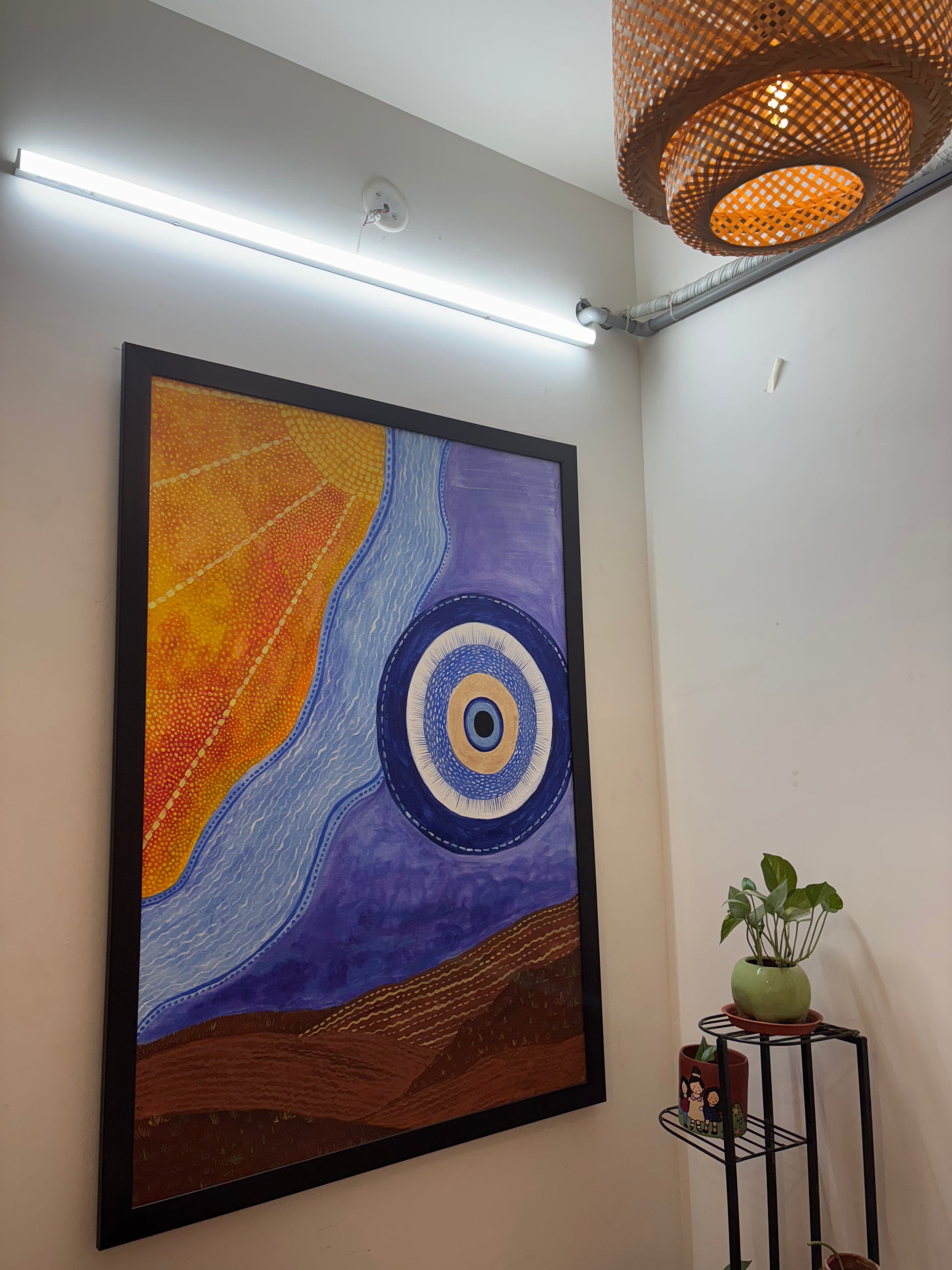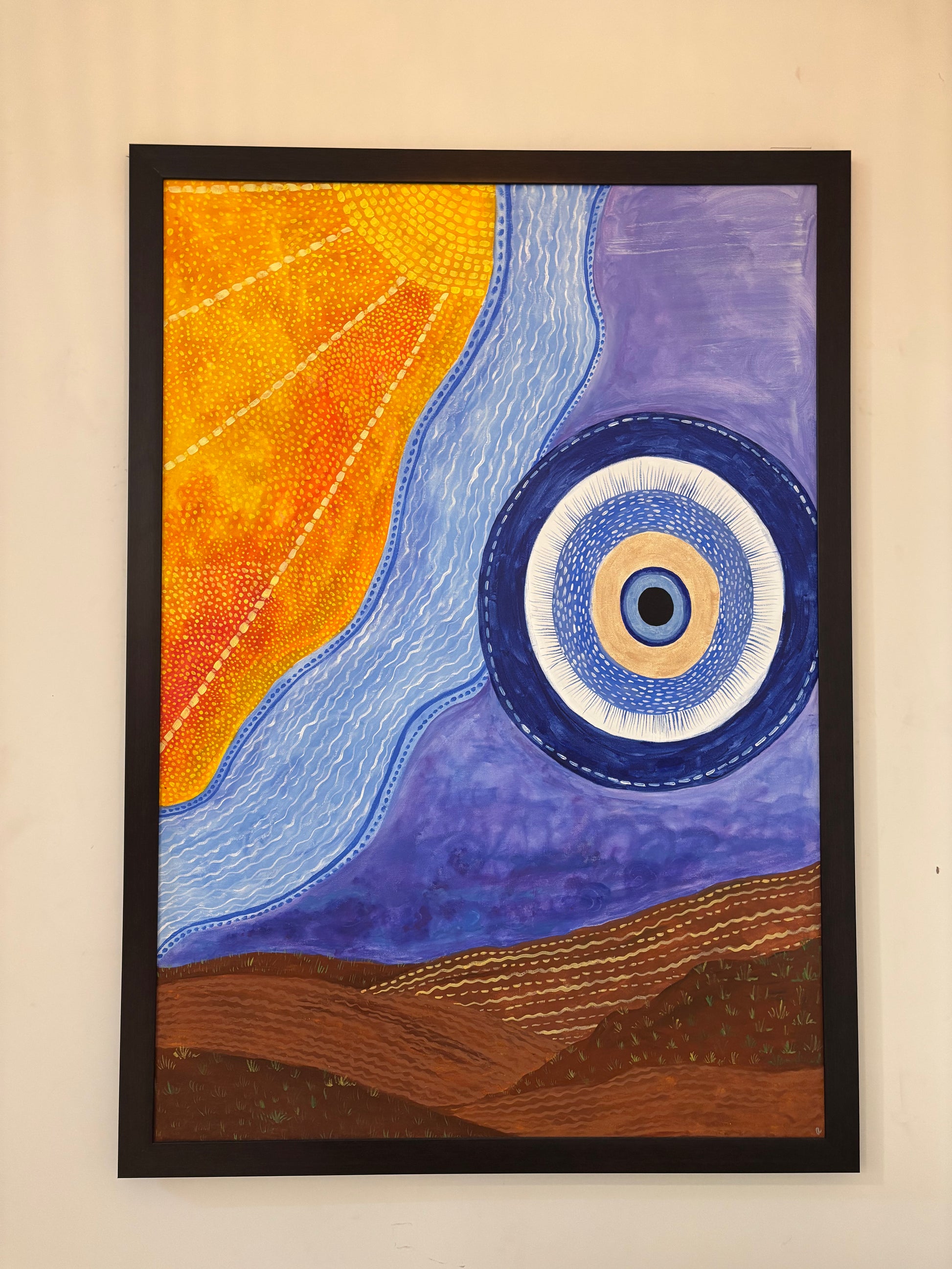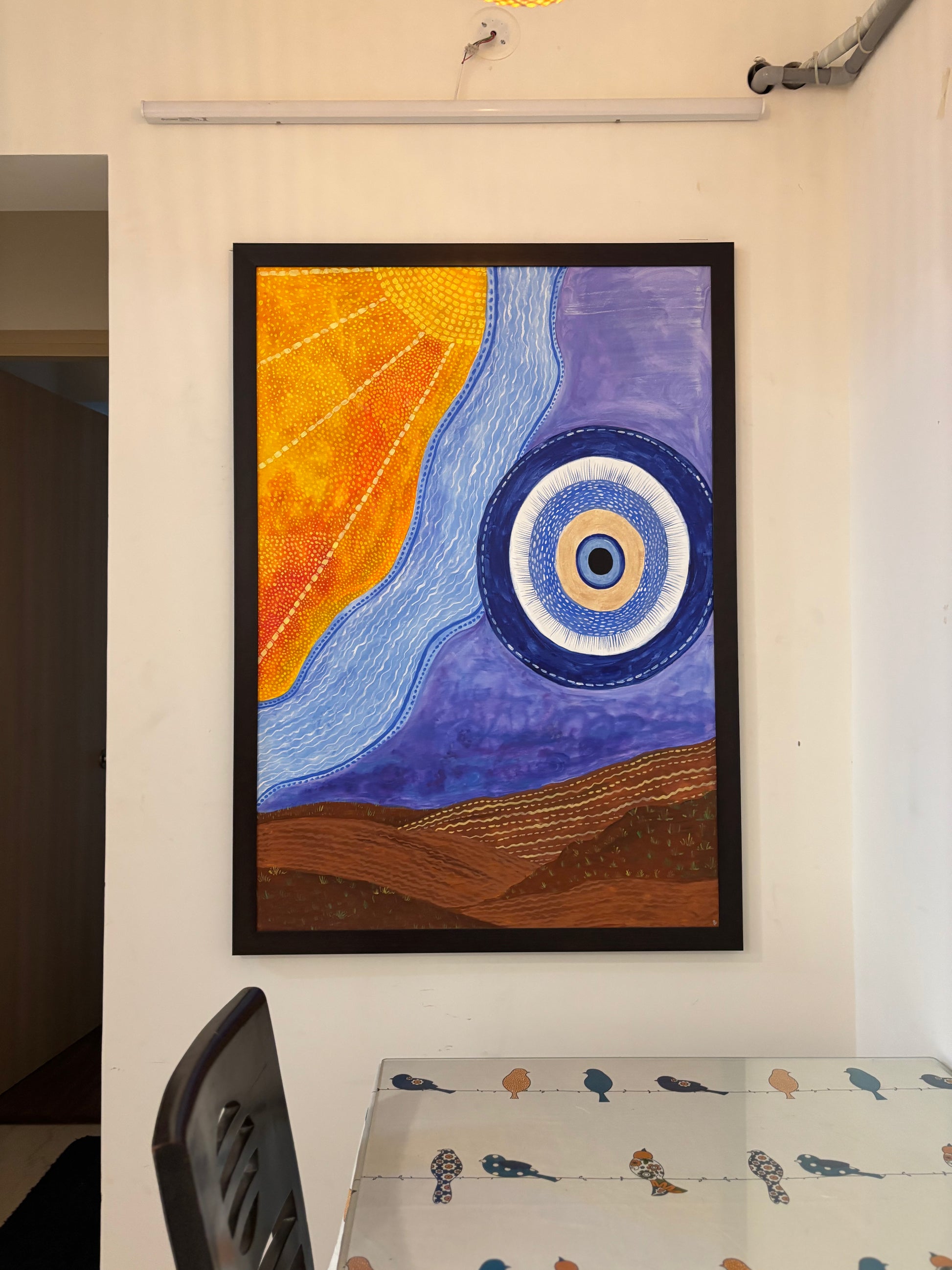At its center lies a circular cosmic eye, inspired by the protective energy of the nazar battu (evil eye). This motif anchors the artwork, symbolizing protection, balance, and the constant presence of universal energy.