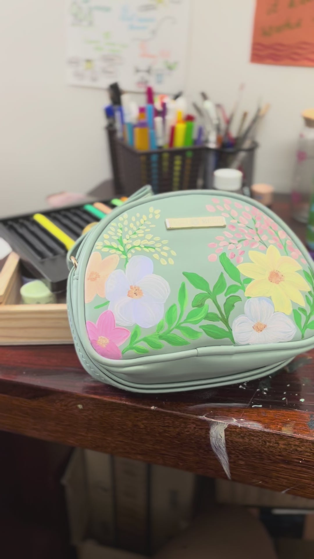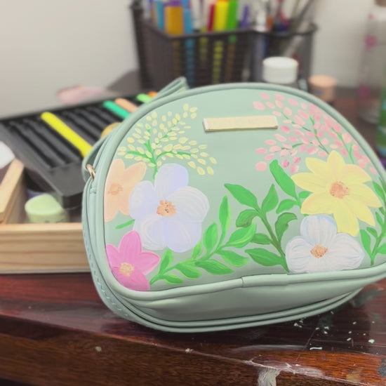 Like the soft hues of twilight, Saanjh carries the quiet calm of a fading sky. With hand-painted florals in pale lilac, blush, and yellow on a muted sage base, this pouch brings a tender, almost whispered beauty to your everyday. Whether you carry it solo or slip it into your tote, it’s a little piece of peace you take along.