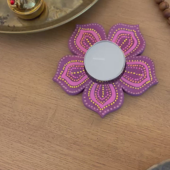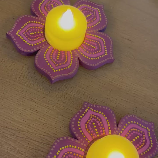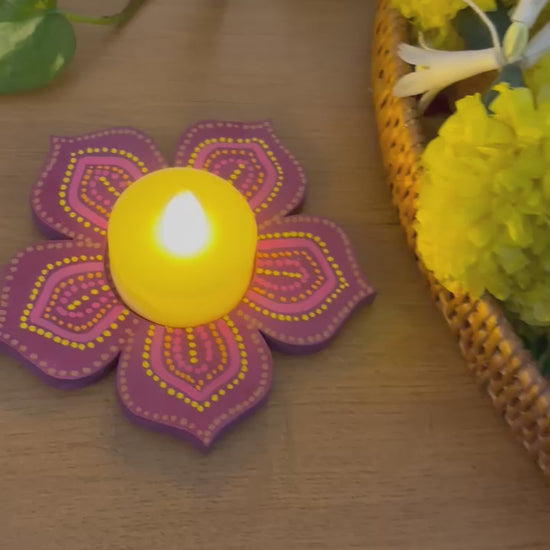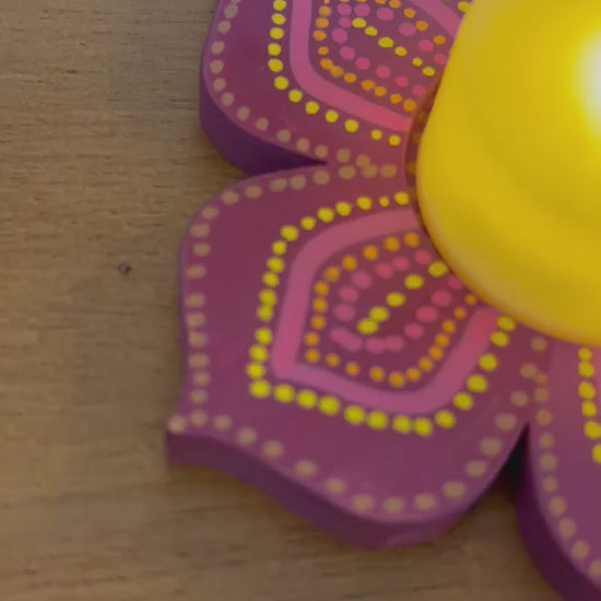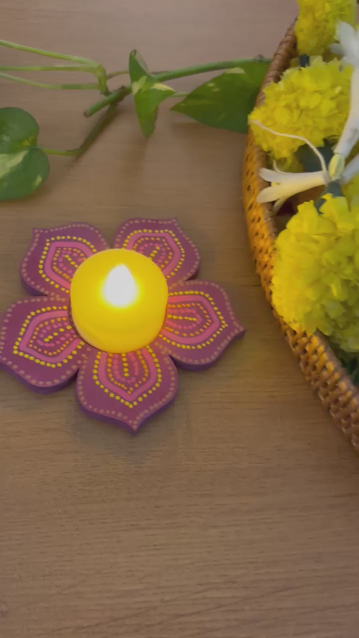 Brighten up your space with Kamal – a hand-painted wooden tea light holder shaped like a blooming lotus. Inspired by traditional rangoli motifs, this purple floral candle holder is dotted in shades of pink, yellow, and white, creating a vibrant yet serene accent for your home. Whether it’s Diwali, a housewarming, or just an evening of calm, Kamal adds warmth and handcrafted charm to any setting.
