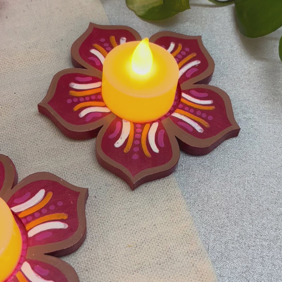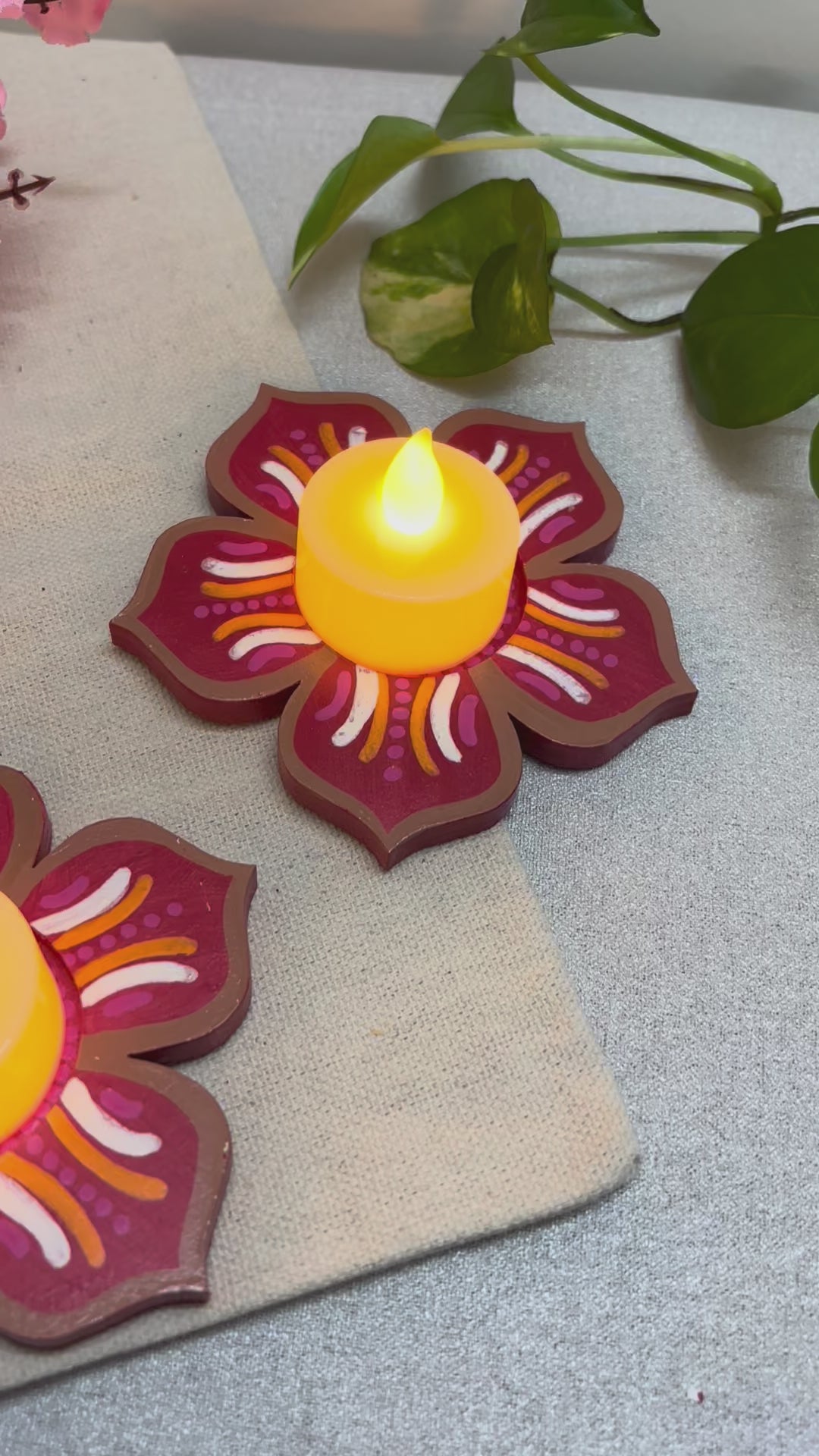 The Kusum Hand-Painted Tea Light Holders bring a touch of nature into your home. Crafted in a six-petal floral design and painted in deep maroon with bright pink and yellow detailing, these holders are vibrant yet elegant. Their flower shape makes them a versatile choice for festivals, pooja rituals, dining setups, or casual home styling.