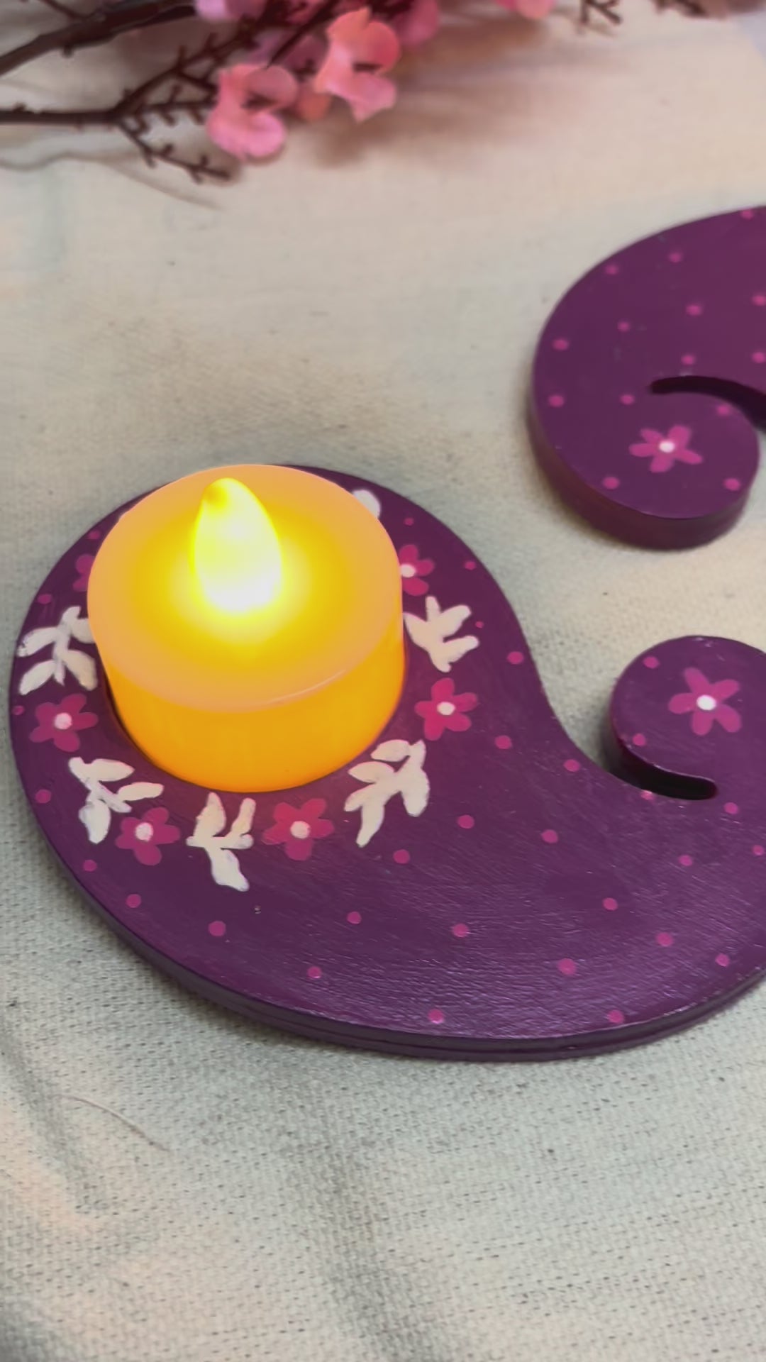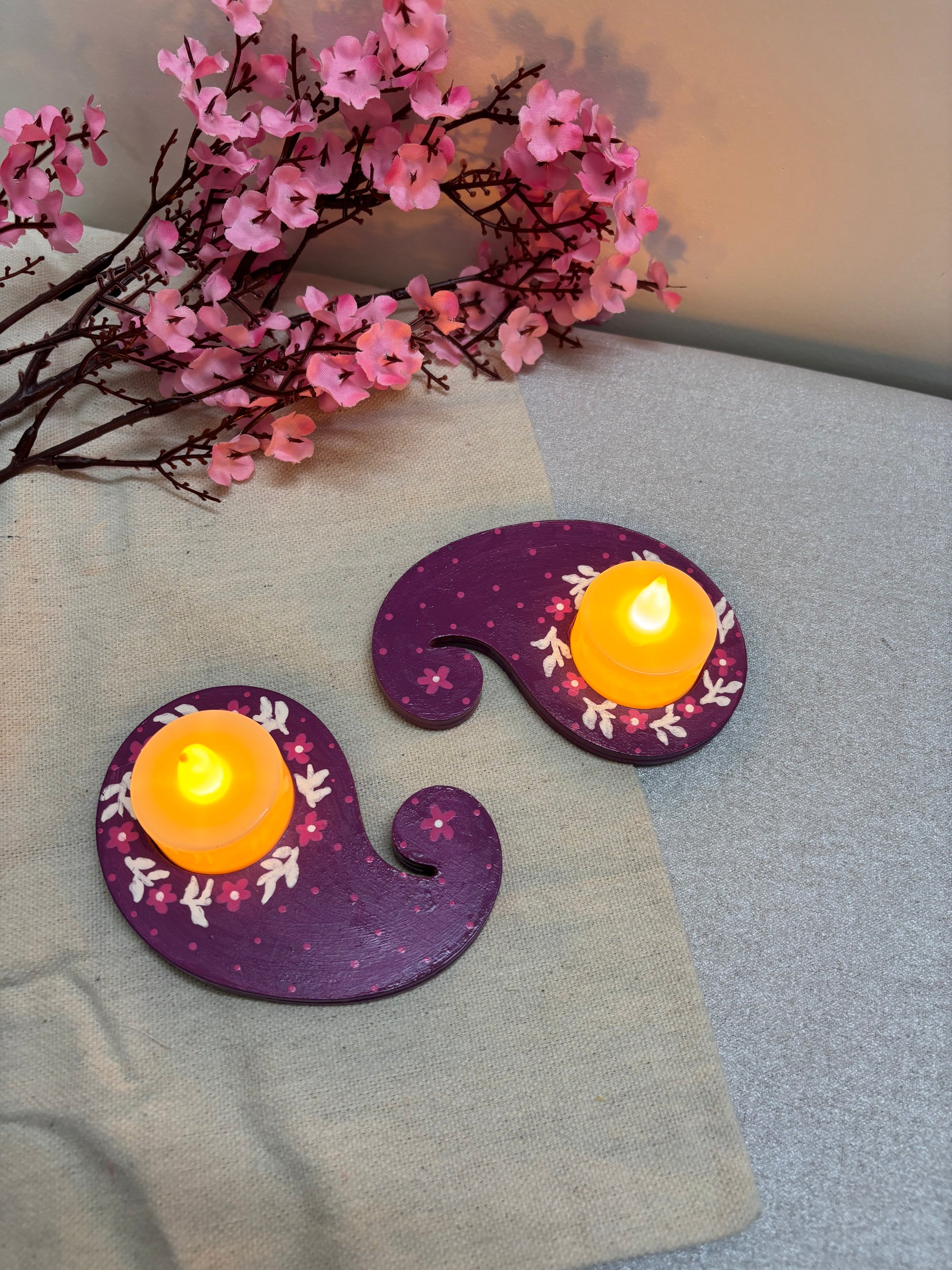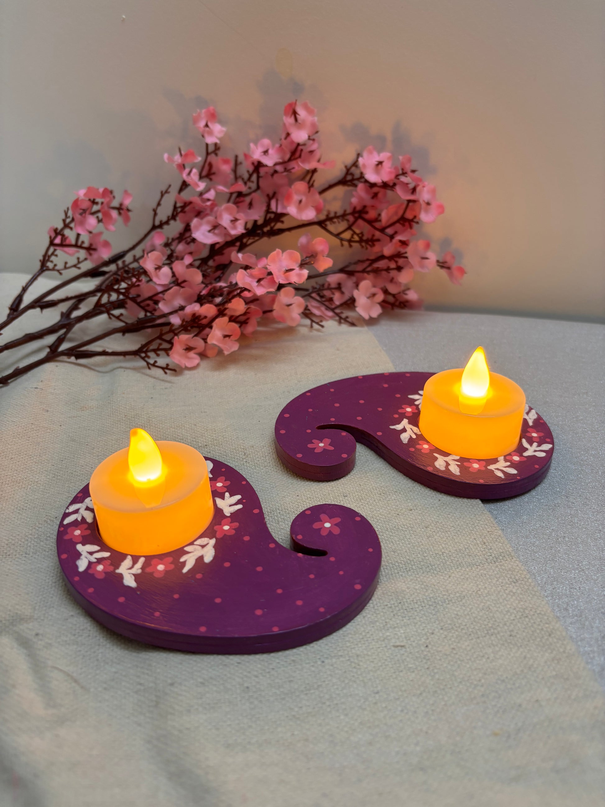 Kalavrit’s Lavanya Hand-Painted Tea Light Holders are crafted to add refined charm to your festive and everyday spaces. Painted in rich purple with delicate white floral detailing, these paisley-shaped holders embody understated elegance while still carrying the warmth of handcrafted art.