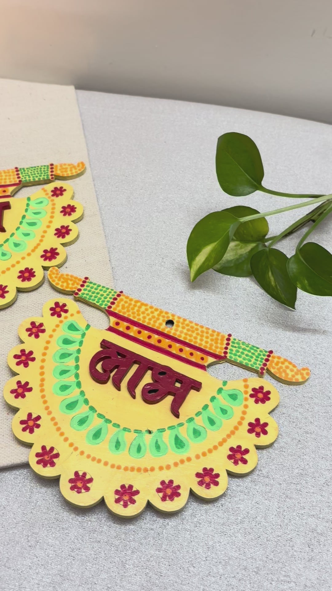 Celebrate every occasion with auspiciousness and joy through the Mangalam Shubh Laabh Wall Hanging. Hand-painted on sturdy MDF, this piece shines with its cheerful yellow base, vibrant red lettering, and intricate green & red floral detailing.