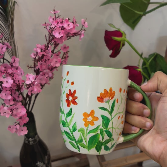 Marigold Mornings is a hand-painted ceramic mug adorned with vibrant marigold-inspired flowers in orange, red, and green. Every floral detail is delicately brushed by hand, making each mug a unique, artful experience.
