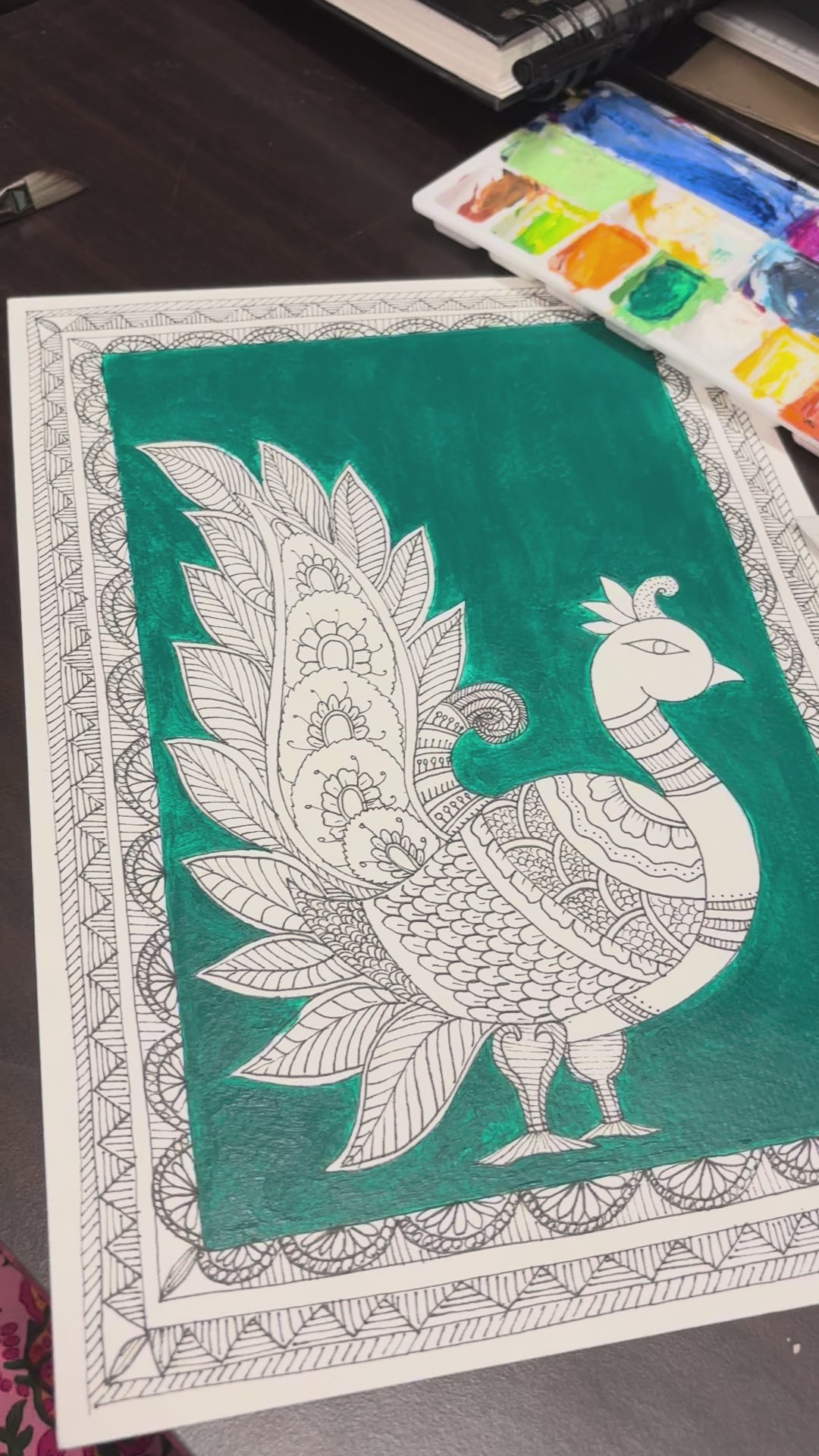“Mayura” (मयूर) - Sanskrit for peacock - is a symbol of beauty, grace, and abundance in Indian art and mythology. This artwork draws from the Madhubani painting tradition, using intricate line patterns and a deep emerald backdrop to highlight the elegance of the peacock, India’s national bird.