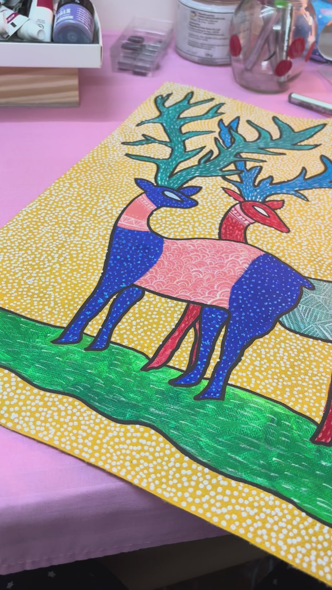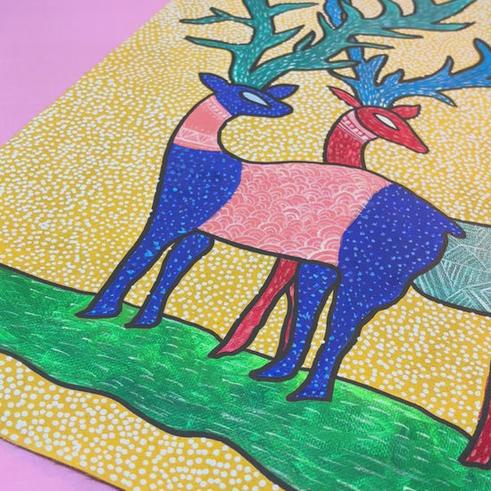“Mruga” celebrates the gentle spirit of the deer - a symbol of intuition, grace, and harmony - rendered in the timeless Gond folk art style. Every line and dot is painted freehand with acrylics, transforming fabric into a storytelling canvas.