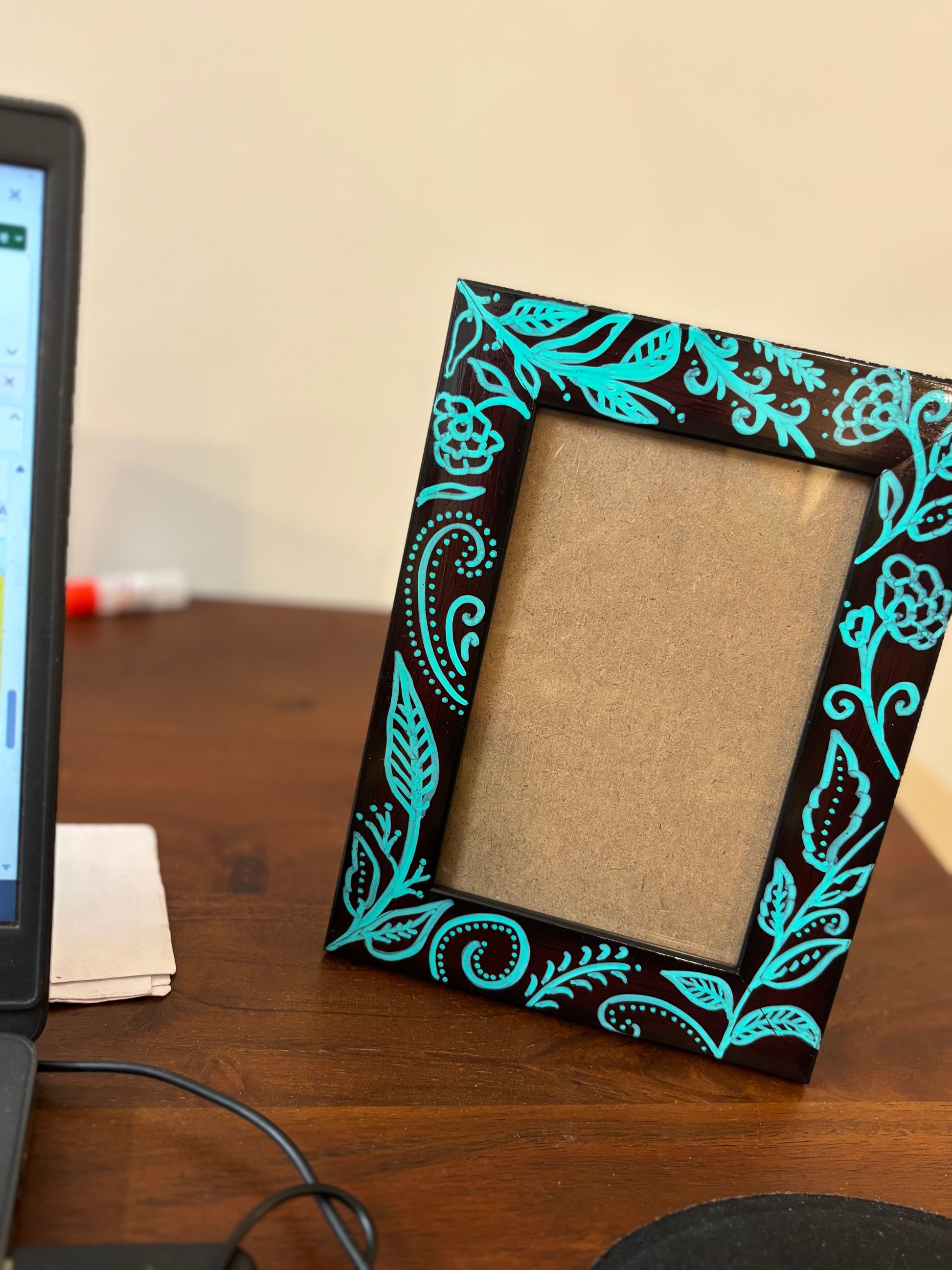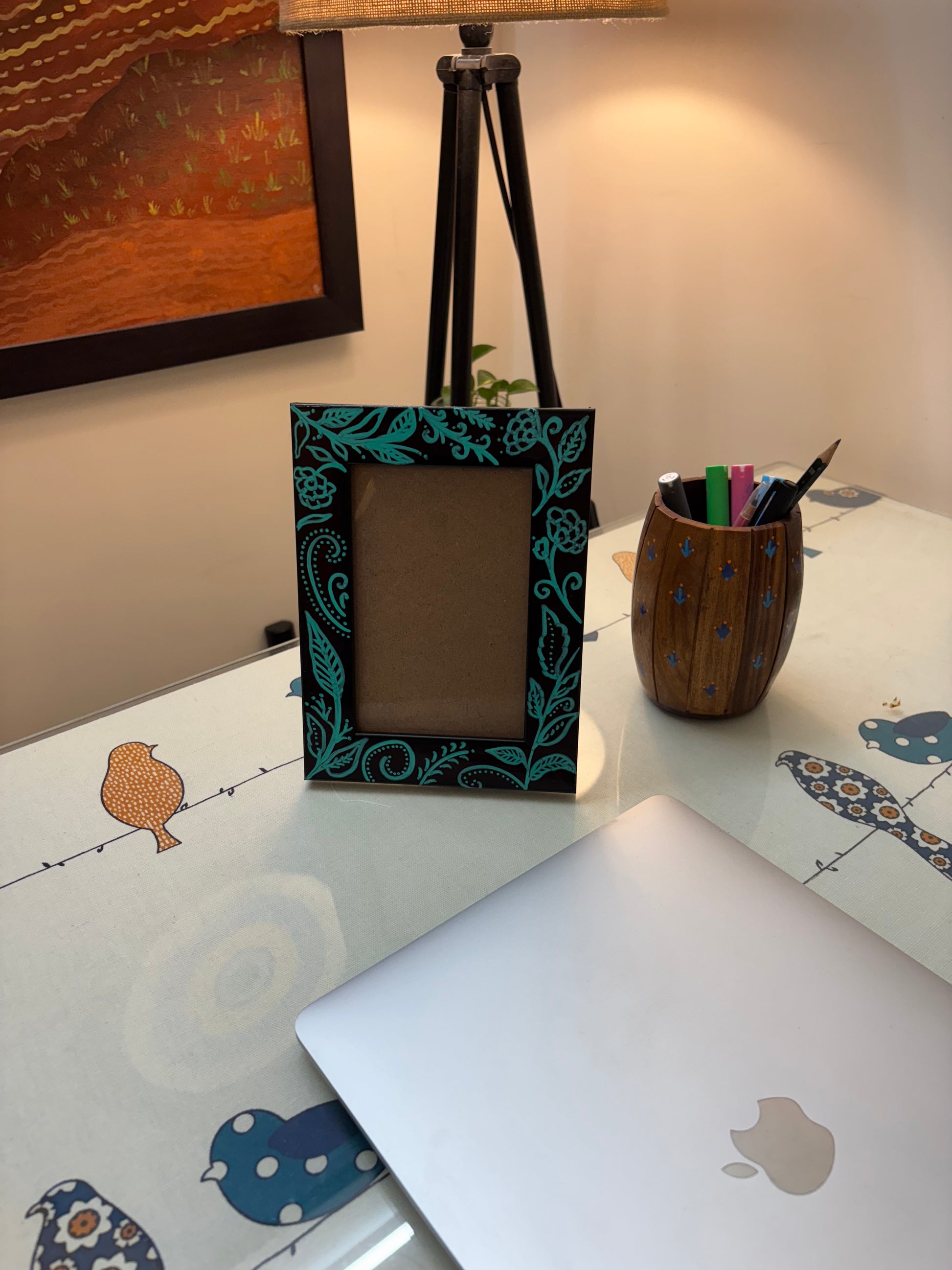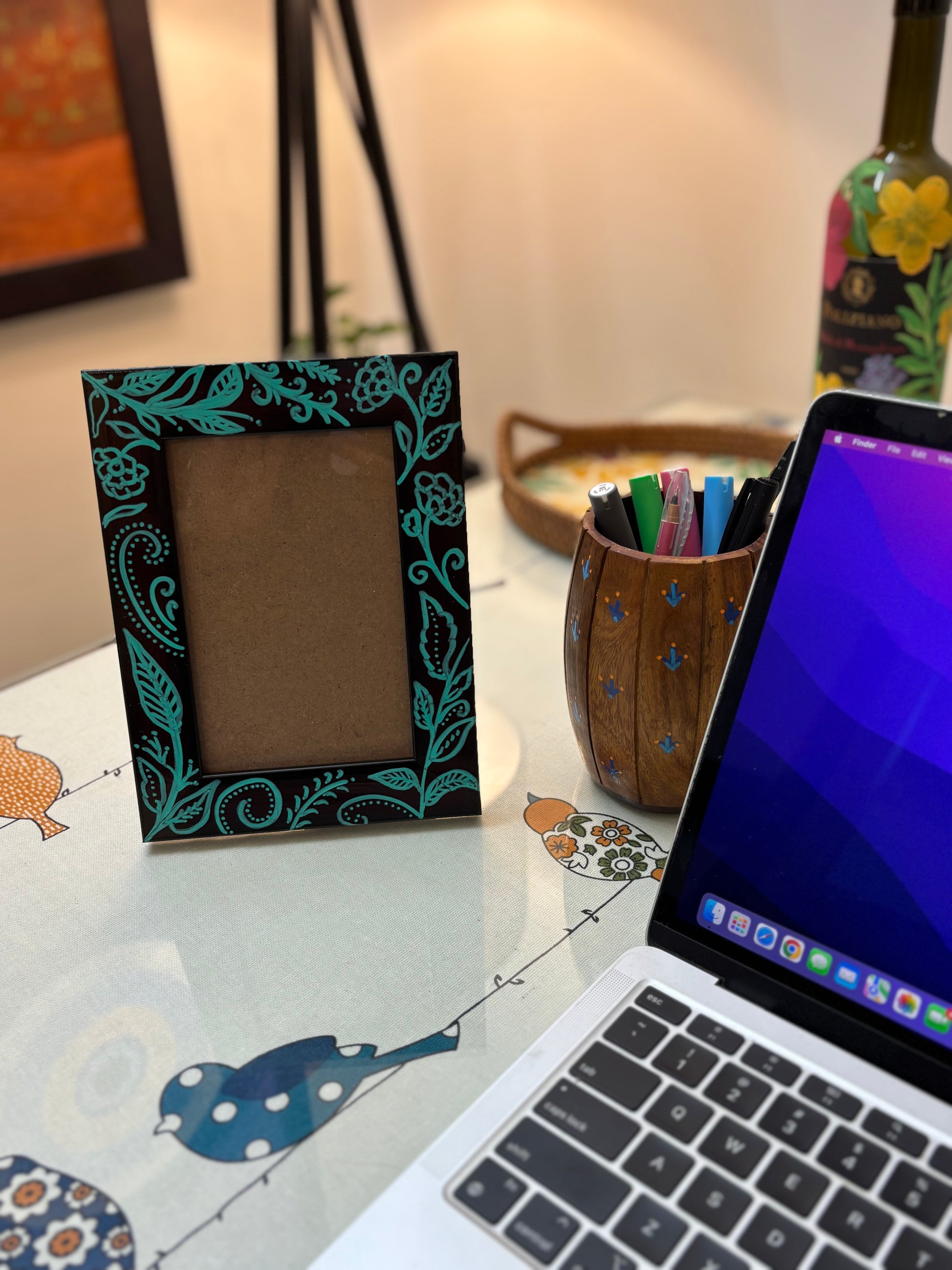 Bring a touch of mystique to your memories with Mystica. This hand-painted wooden photo frame features bold teal paisley patterns on a deep black base, creating a striking blend of elegance and art.