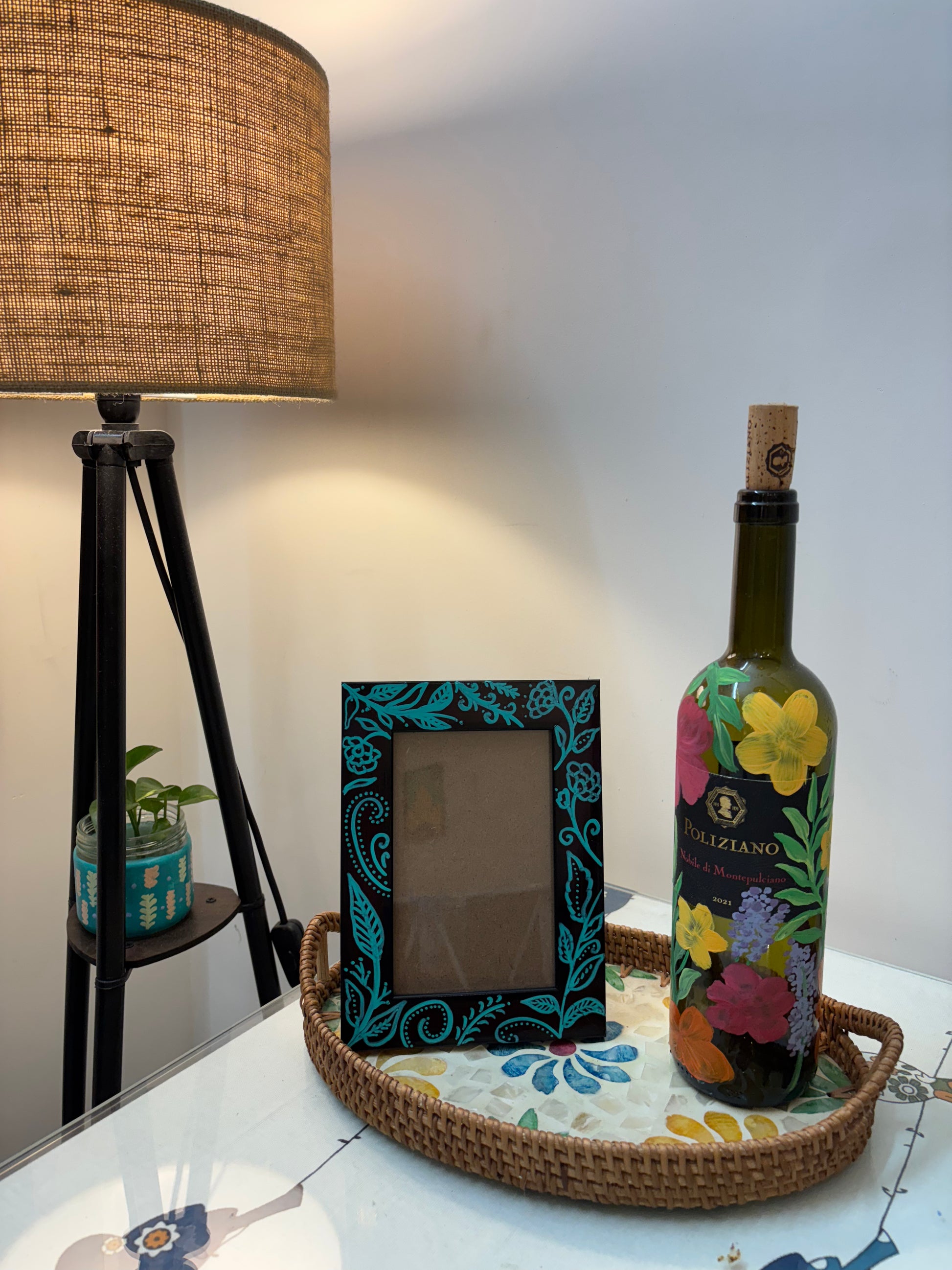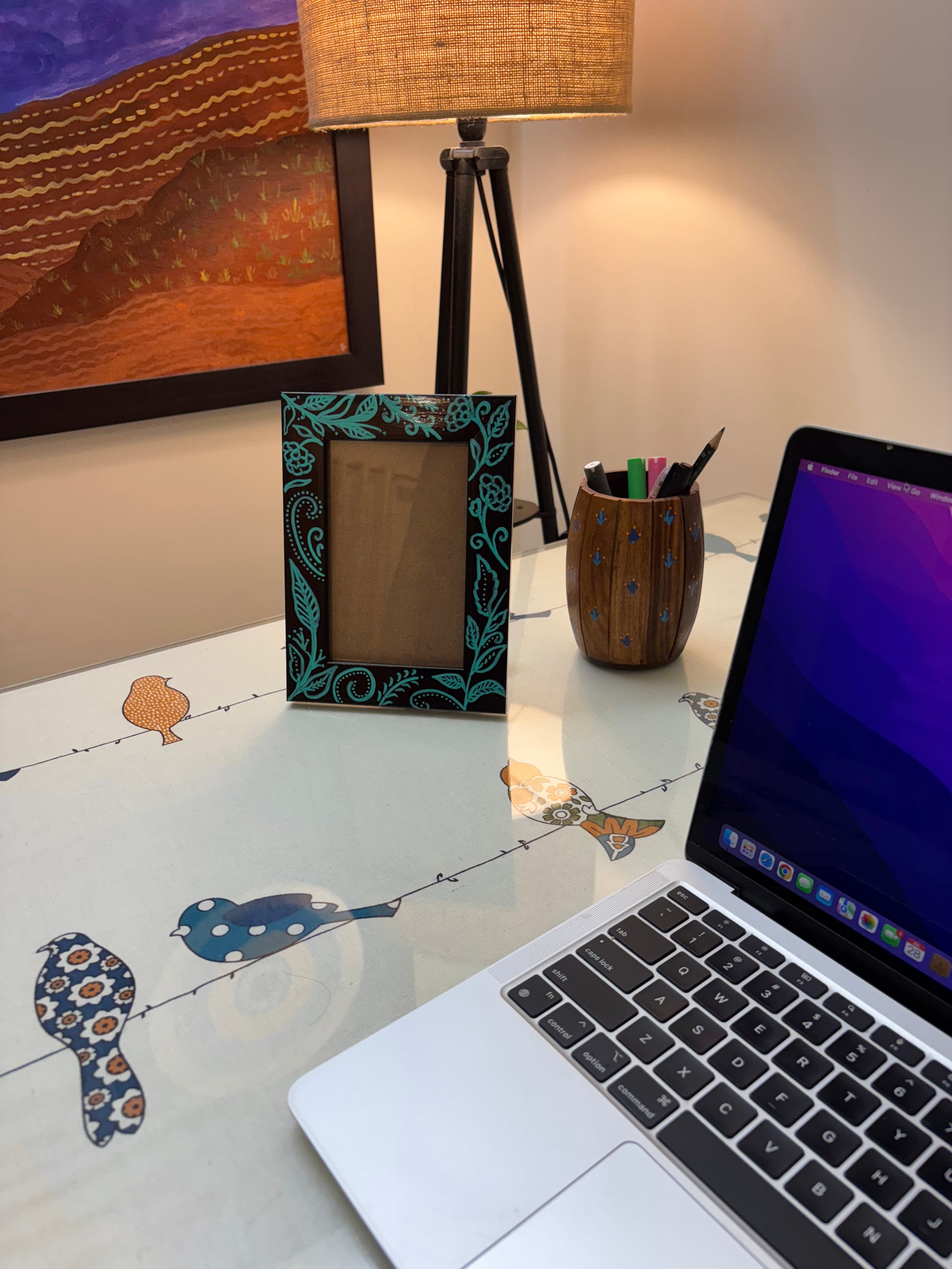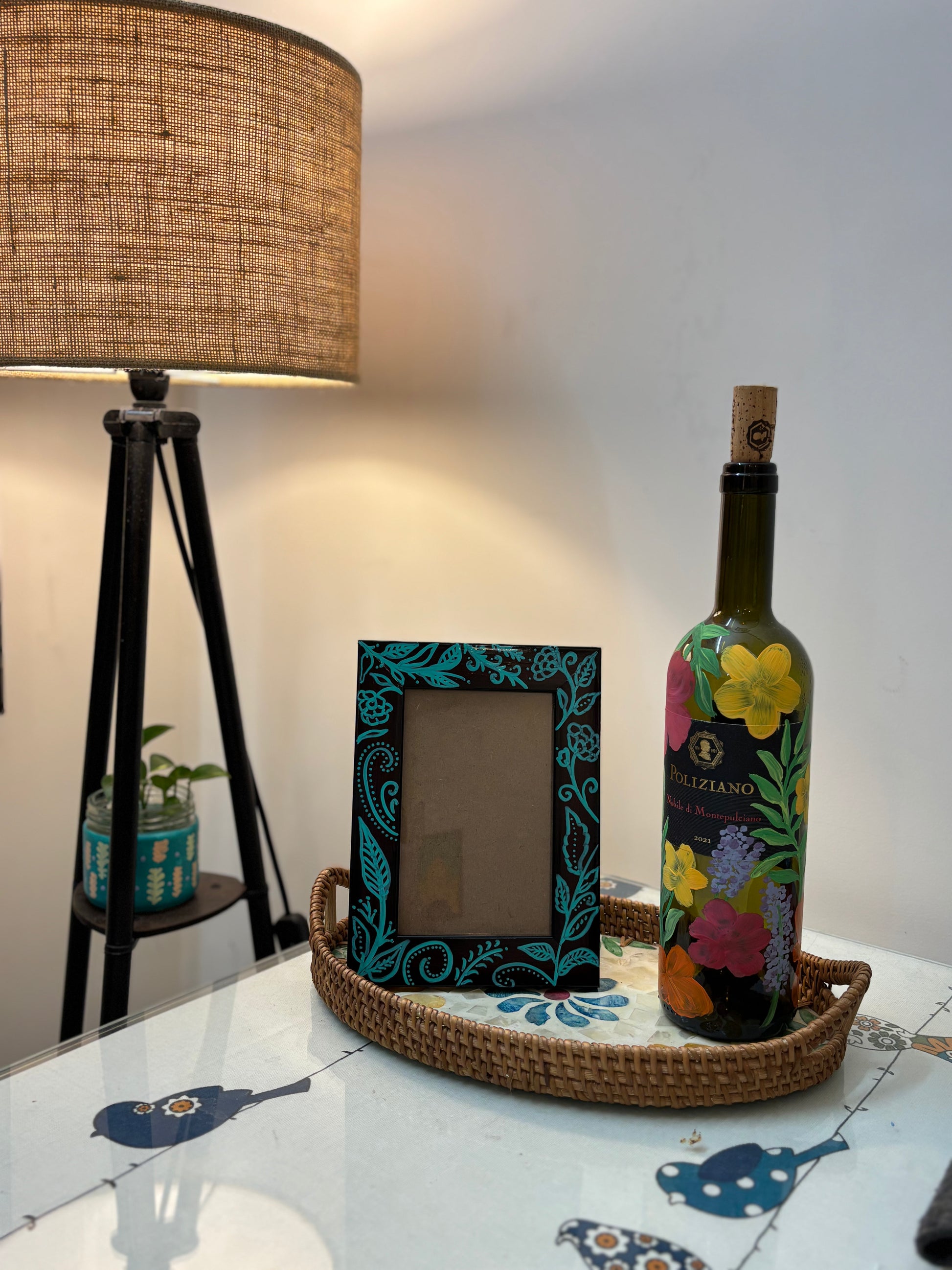 Bring a touch of mystique to your memories with Mystica. This hand-painted wooden photo frame features bold teal paisley patterns on a deep black base, creating a striking blend of elegance and art.