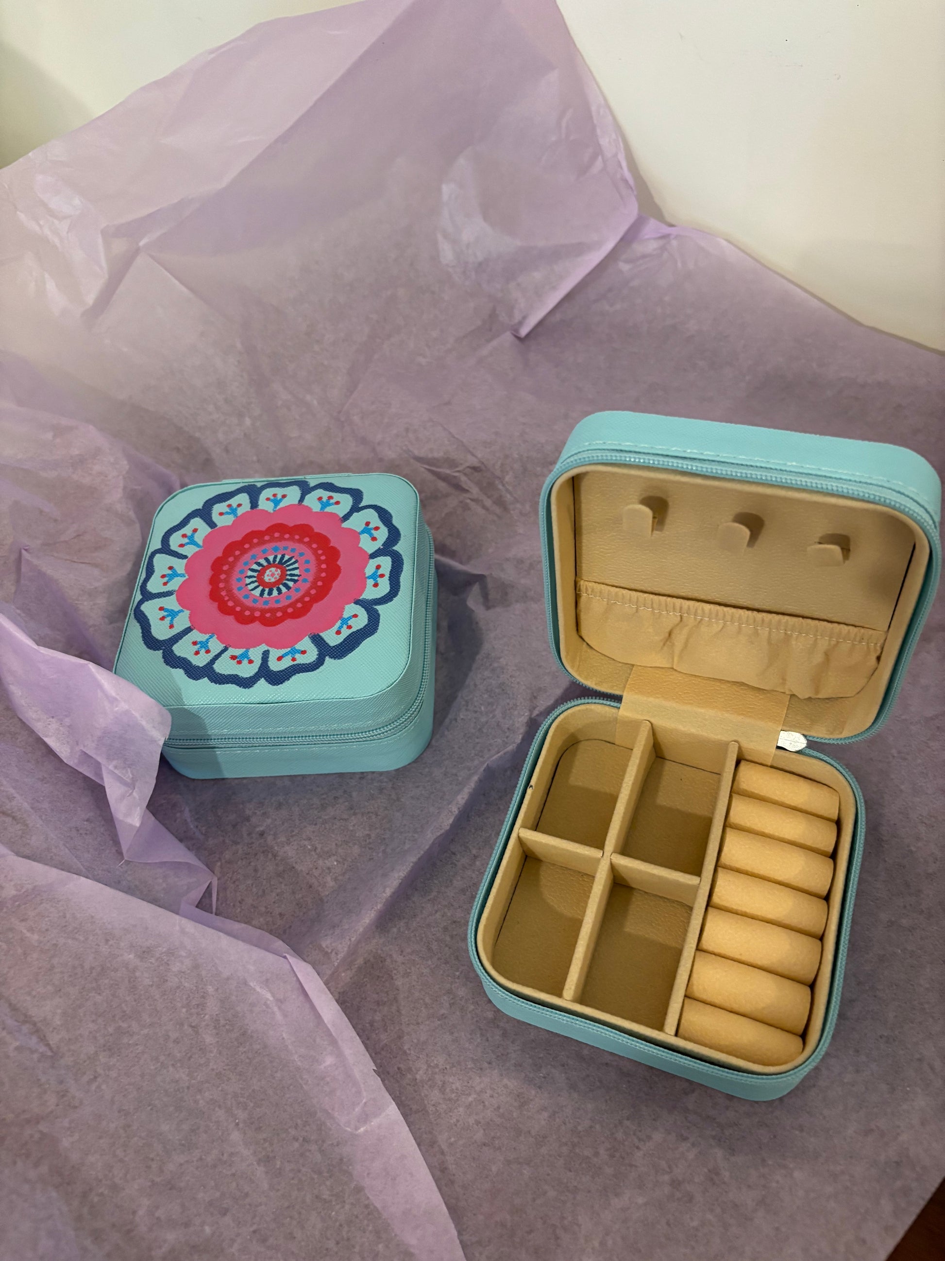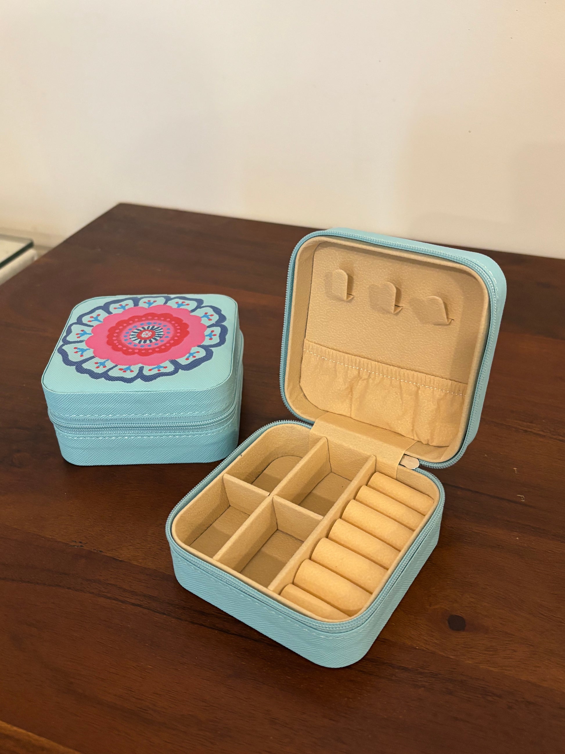 Pankhuri is a hand-painted, compact jewellery box designed to hold your everyday trinkets and travel treasures. With a soft beige interior, dedicated slots for rings, earrings, and chains - it’s as functional as it is beautiful. The sky-blue exterior is adorned with a delicate floral mandala, making each piece one-of-a-kind.