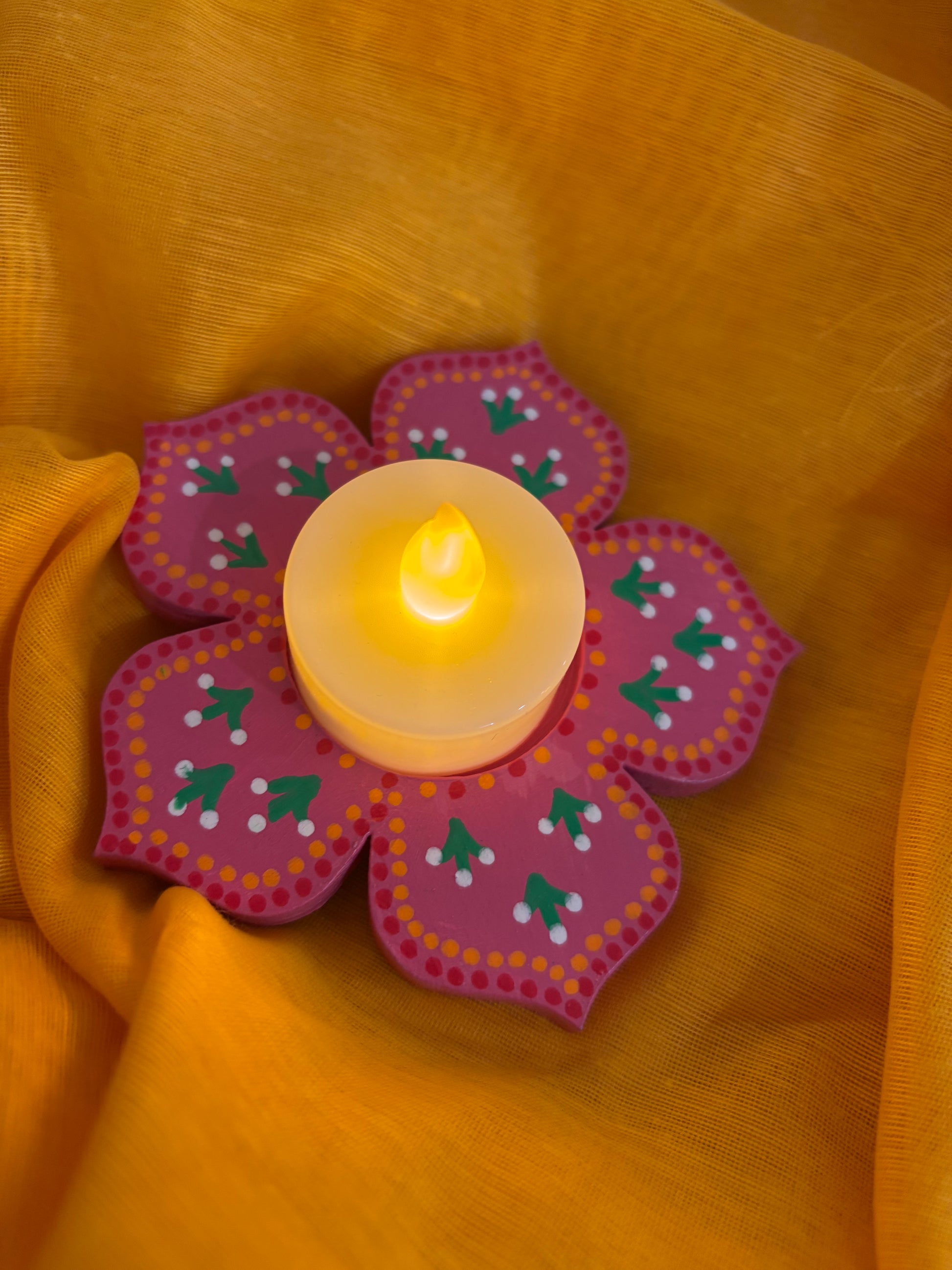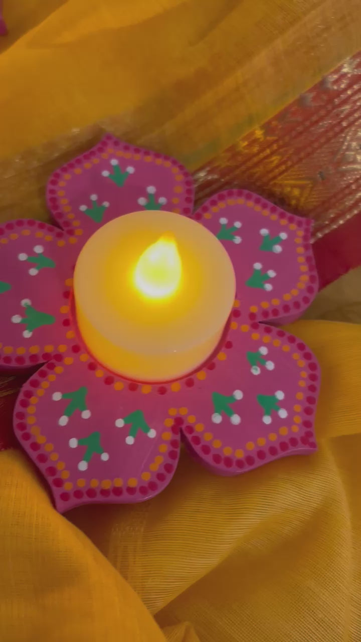 Painted in a radiant pink with intricate white and blue accents, each holder is designed to fit standard-sized tea lights. Pair them with gifts, use them as table centerpieces, or place them near your pooja corner - they shine wherever they go.