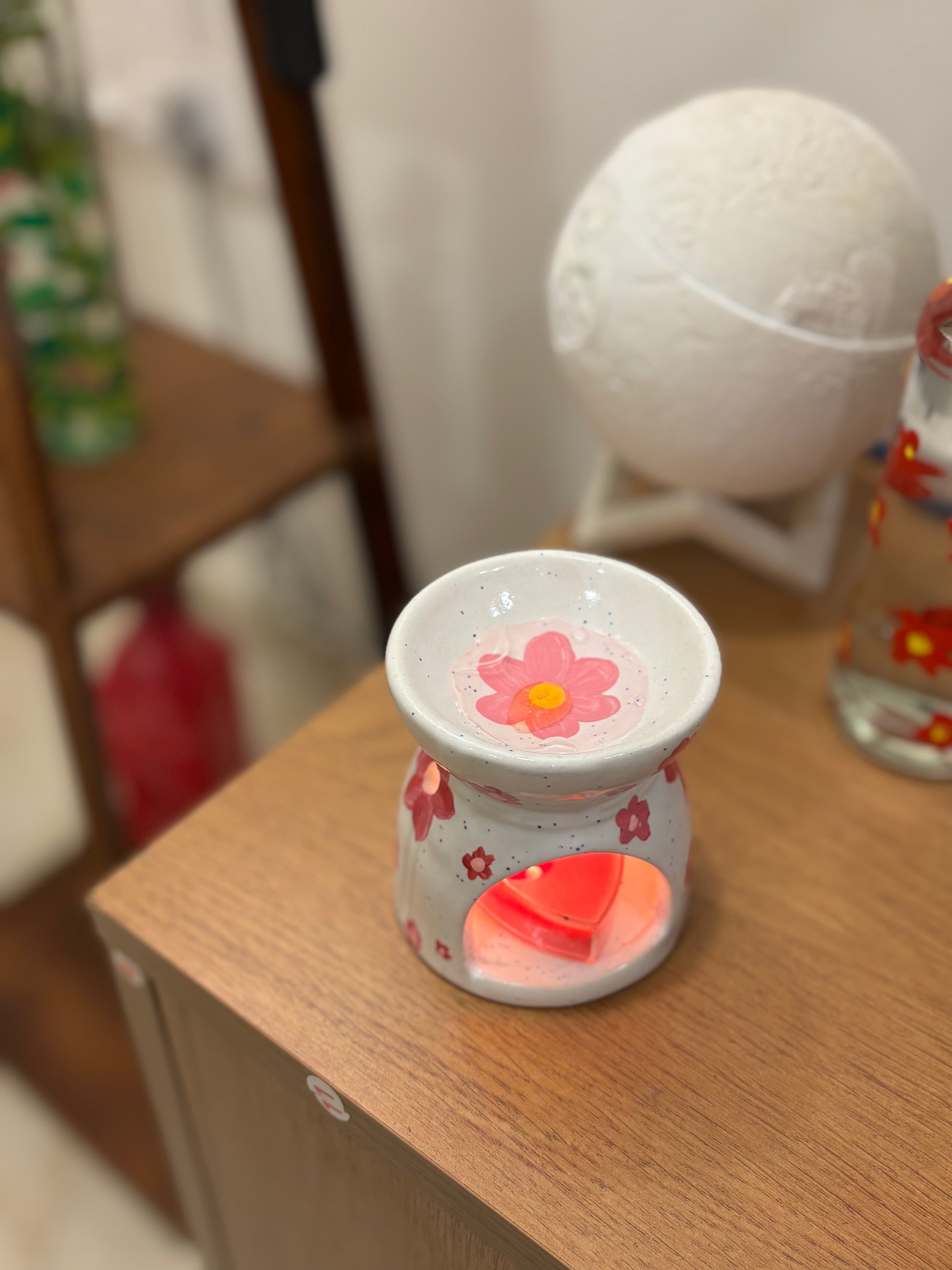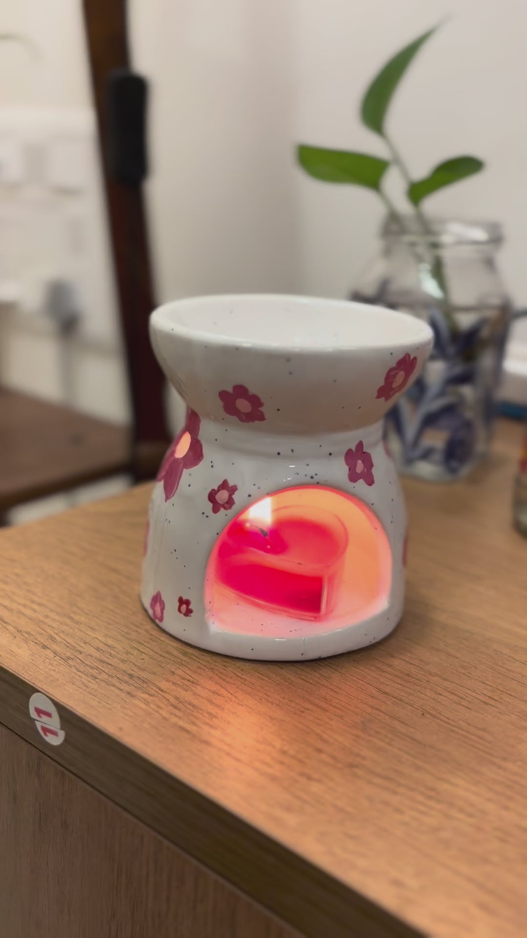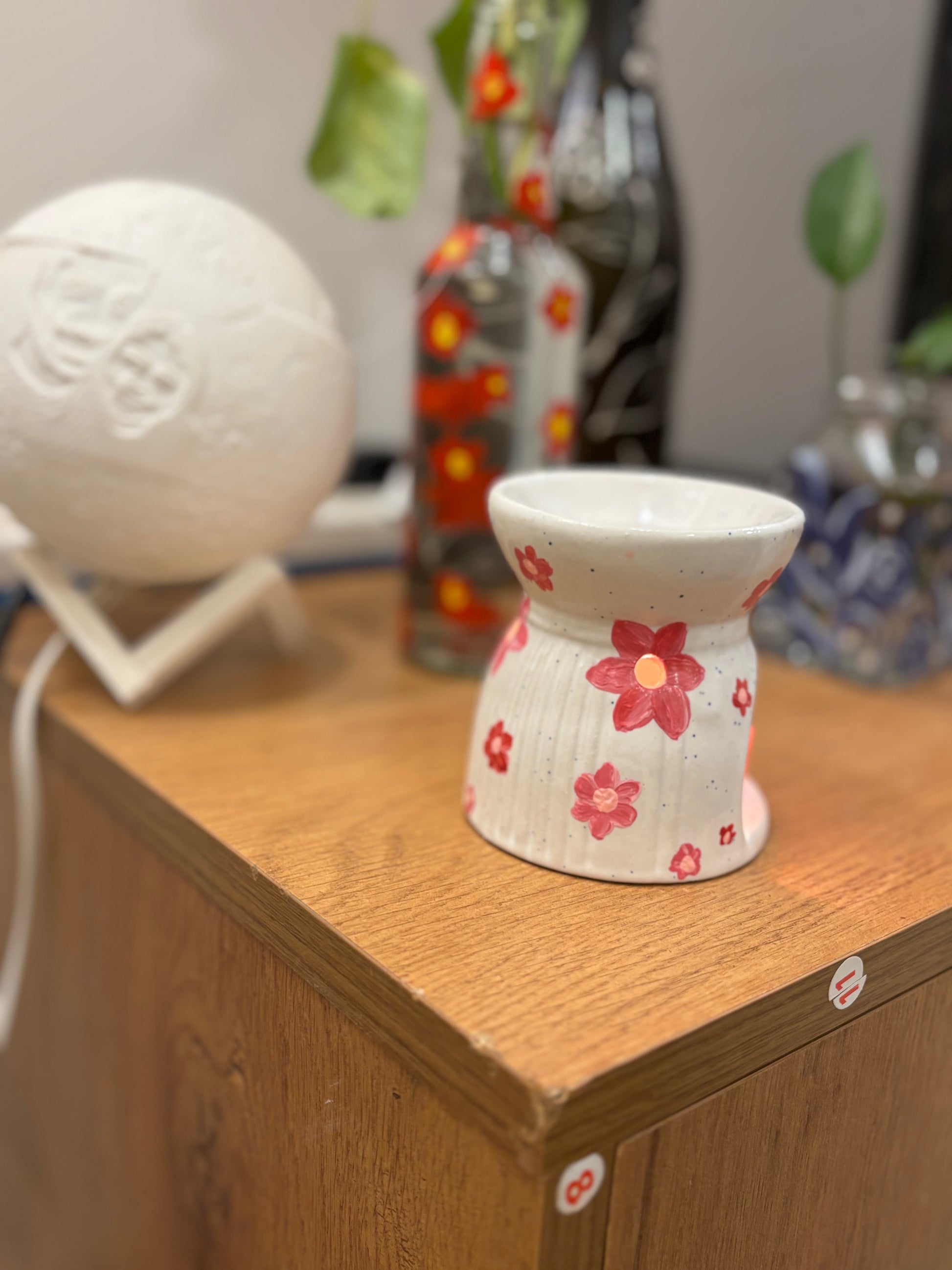 Prima is a handcrafted ceramic aroma diffuser, painted with dainty pink blossoms reminiscent of spring primroses. A single flame glows softly from within, casting warmth through its delicate floral silhouette. Whether it's a quiet evening ritual or a mindful morning moment, Prima gently infuses your space with scent and serenity.