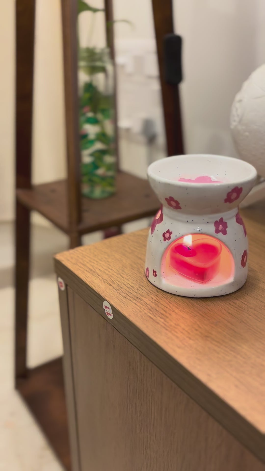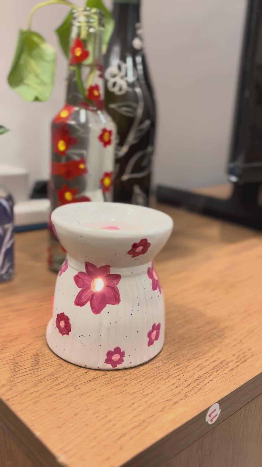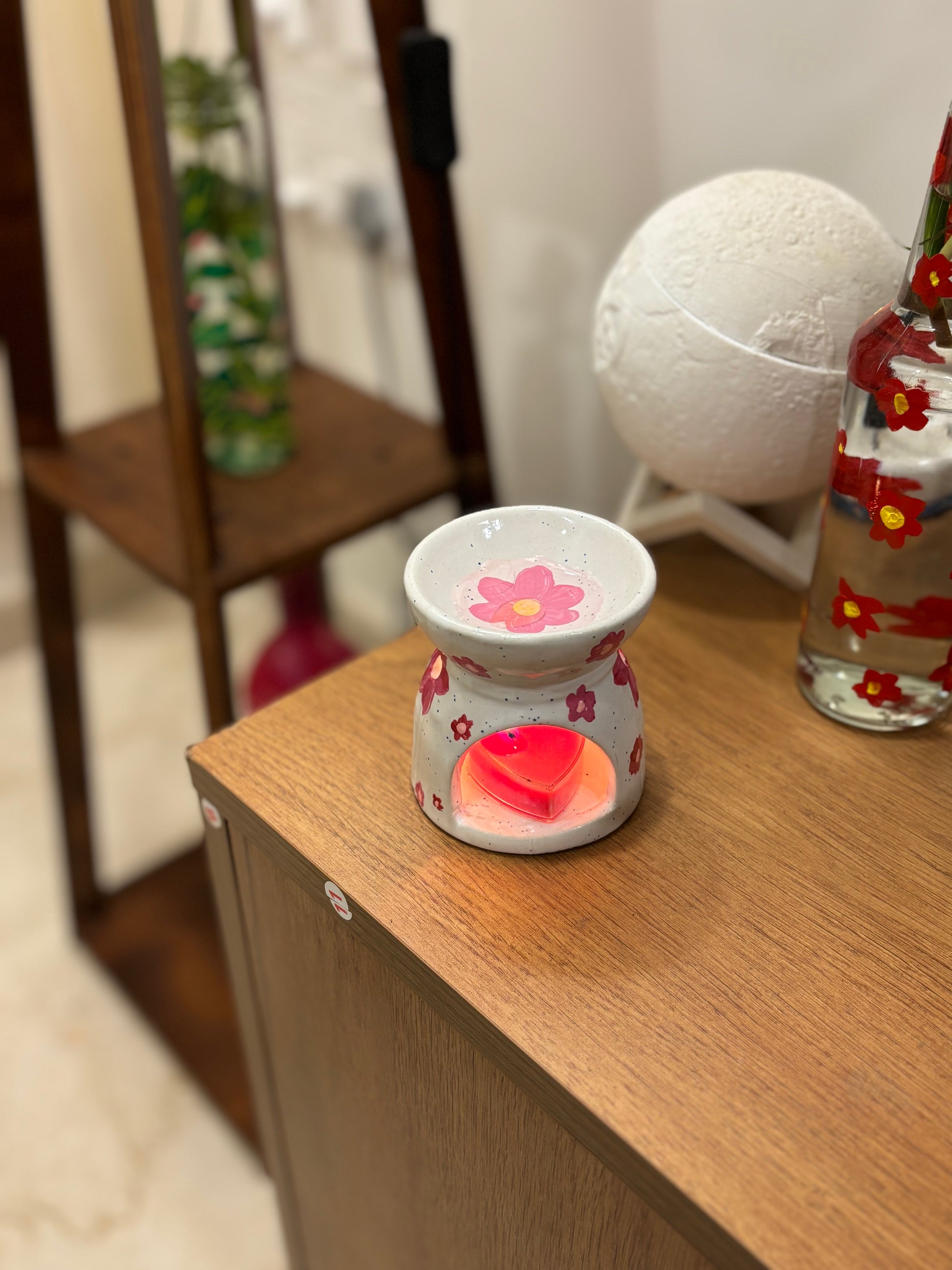 Prima is a handcrafted ceramic aroma diffuser, painted with dainty pink blossoms reminiscent of spring primroses. A single flame glows softly from within, casting warmth through its delicate floral silhouette. Whether it's a quiet evening ritual or a mindful morning moment, Prima gently infuses your space with scent and serenity.