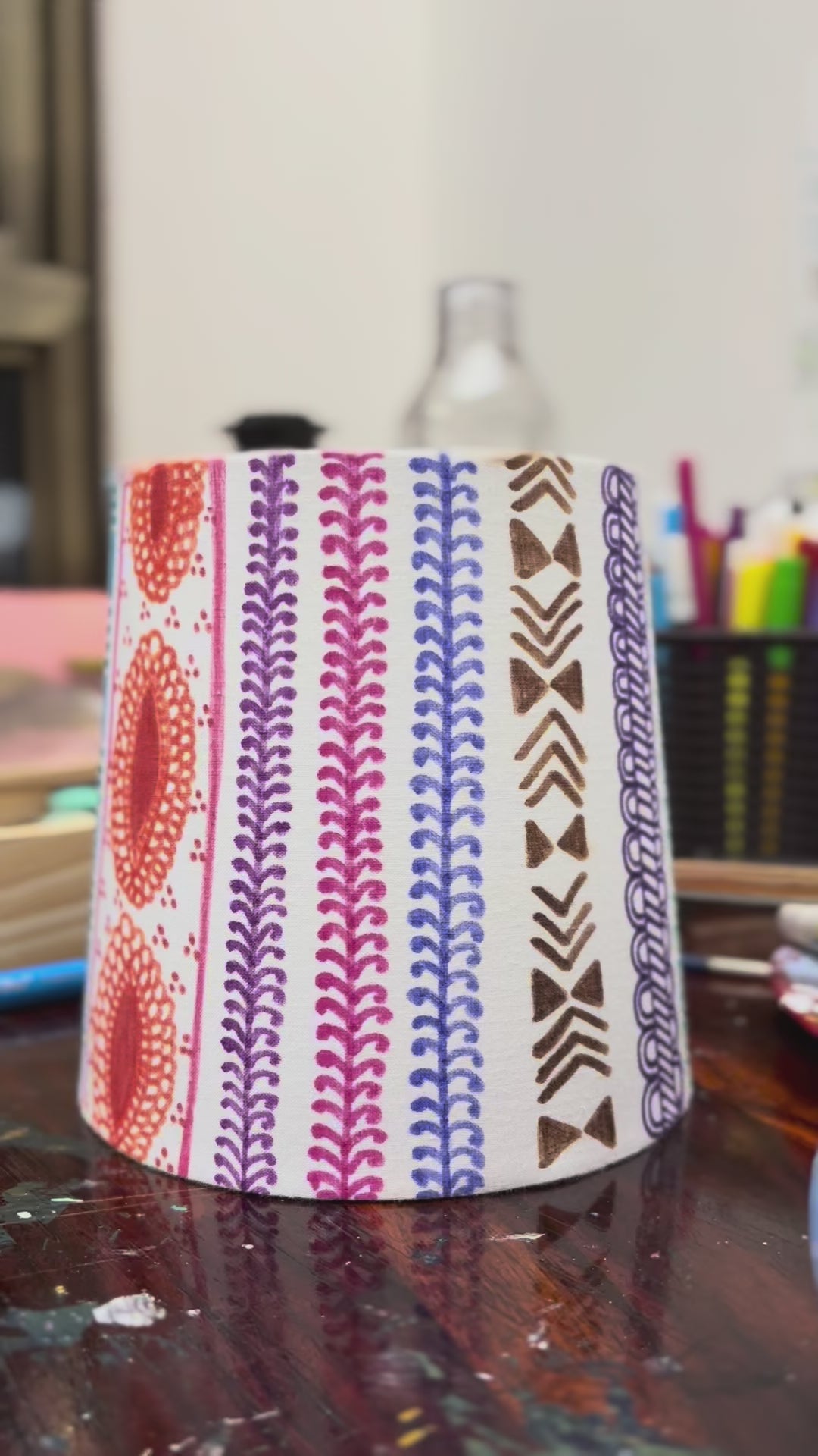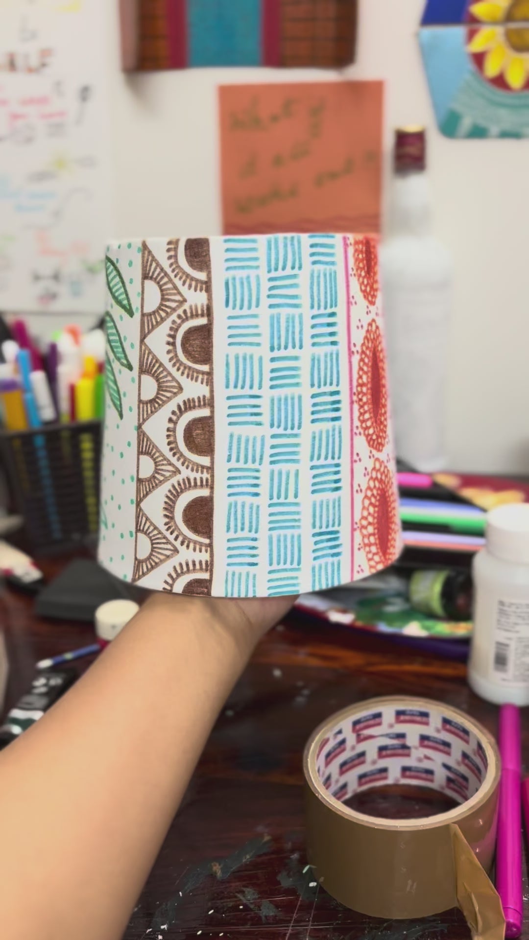 A symphony in color and form - Raag brings together earthy tradition and modern rhythm through hand-painted motifs. Each vertical panel on this drum-shaped shade is a visual note: bold sunbursts, tribal arcs, woven lines, and leafy imprints, all rendered in a palette of terracotta, indigo, green, and brown.
