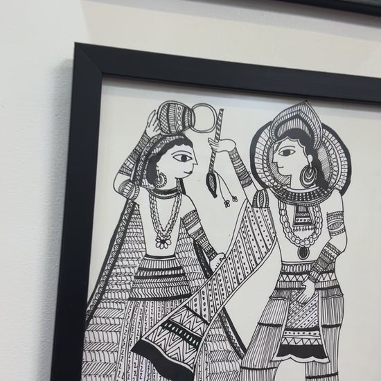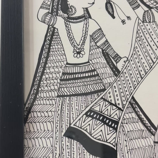 This artwork reimagines Radha and Krishna through the lens of Godna tribal art, an ancient style rooted in tattoo-like line motifs. The monochrome palette and intricate geometric detailing highlight devotion, love, and the eternal bond between the divine couple.