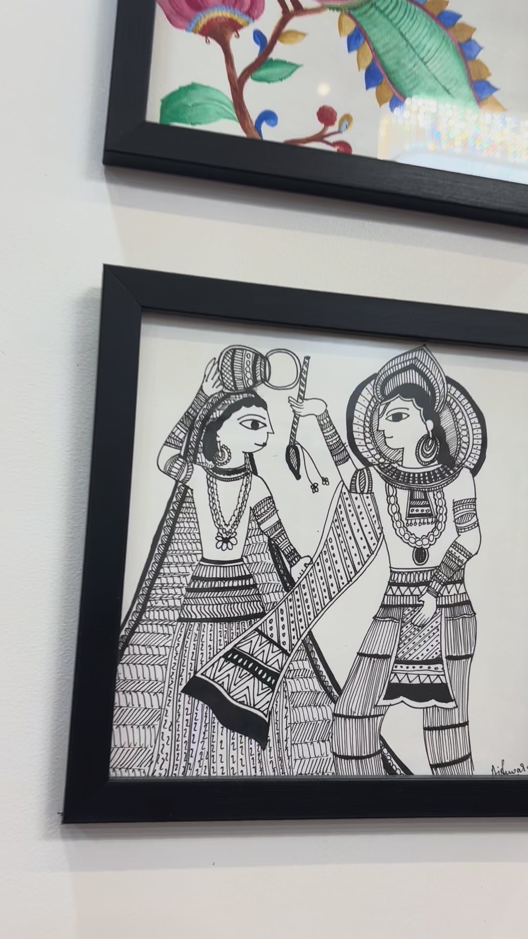 By blending Godna tribal motifs with the timeless story of Radha–Krishna, this artwork bridges folk tradition with devotional symbolism. It radiates love, companionship, and spiritual connection, making it a unique piece for collectors of both folk and sacred art.