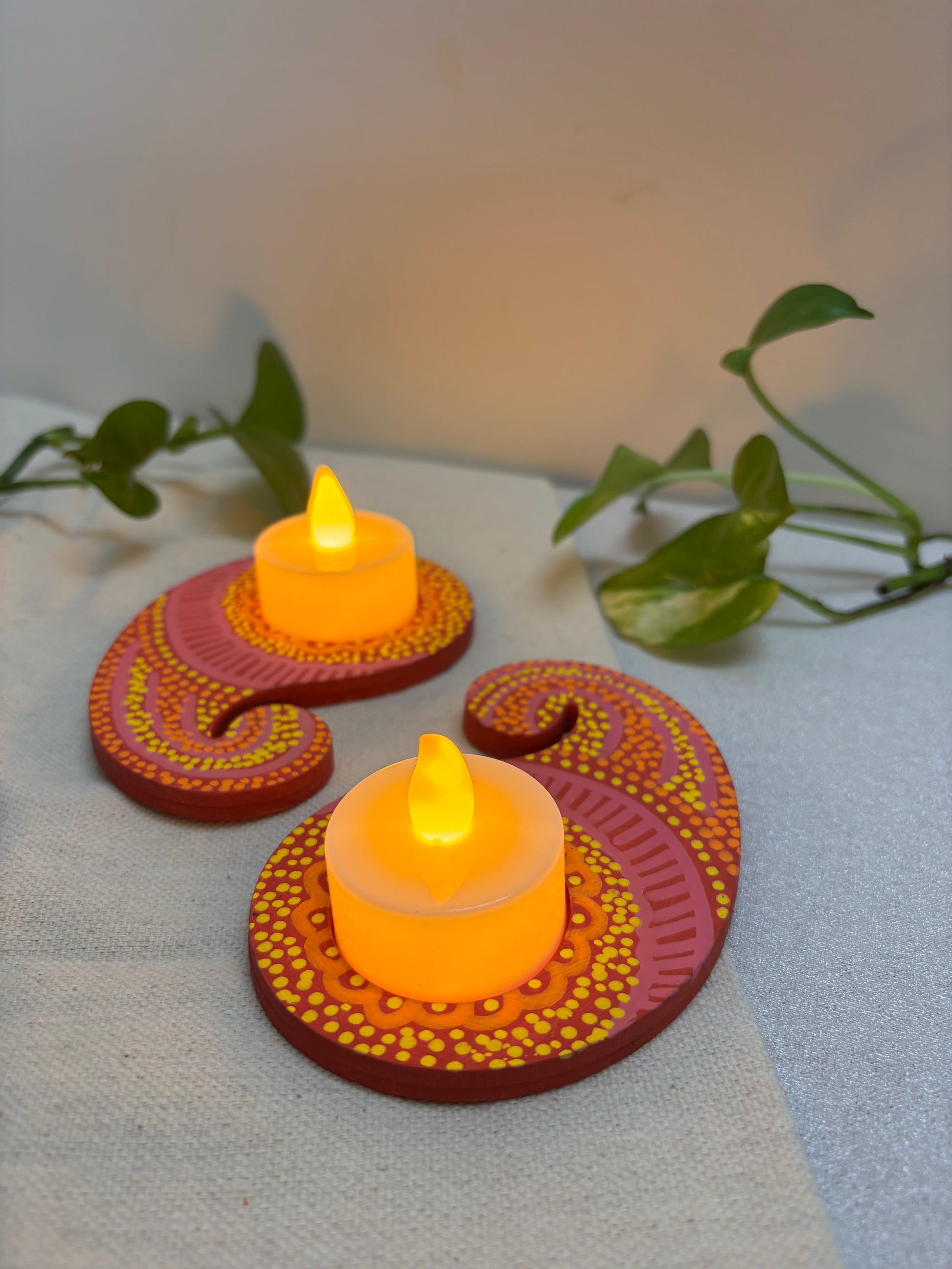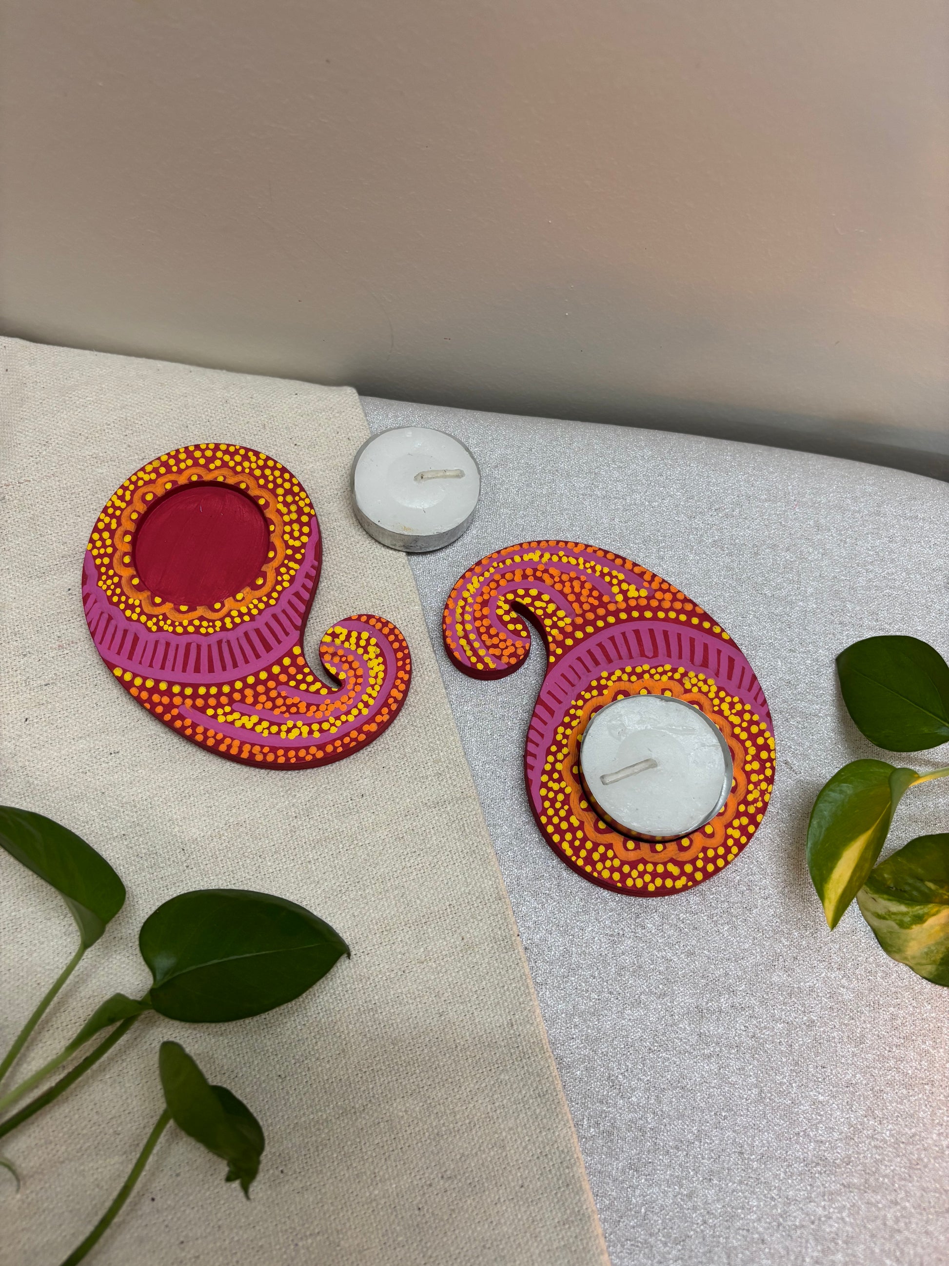 The Roshni Hand-Painted Tea Light Holders are made to light up your celebrations with color and warmth. Crafted in a paisley shape, the holders feature a striking pink base highlighted with orange and yellow dotted detailing. Their bold, festive palette makes them an eye-catching addition to Diwali décor, pooja spaces, or table styling.