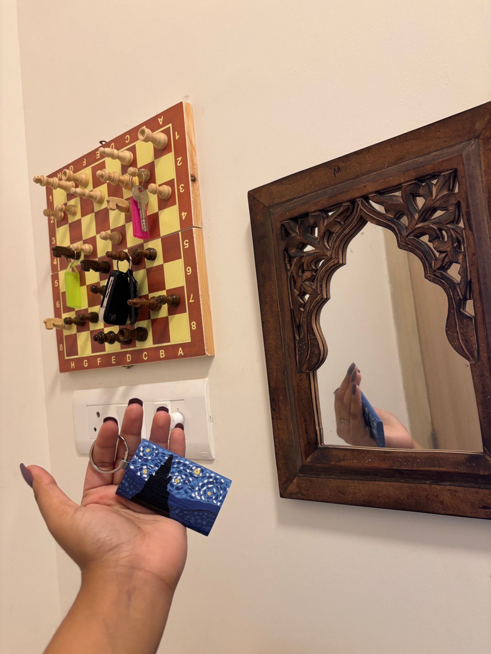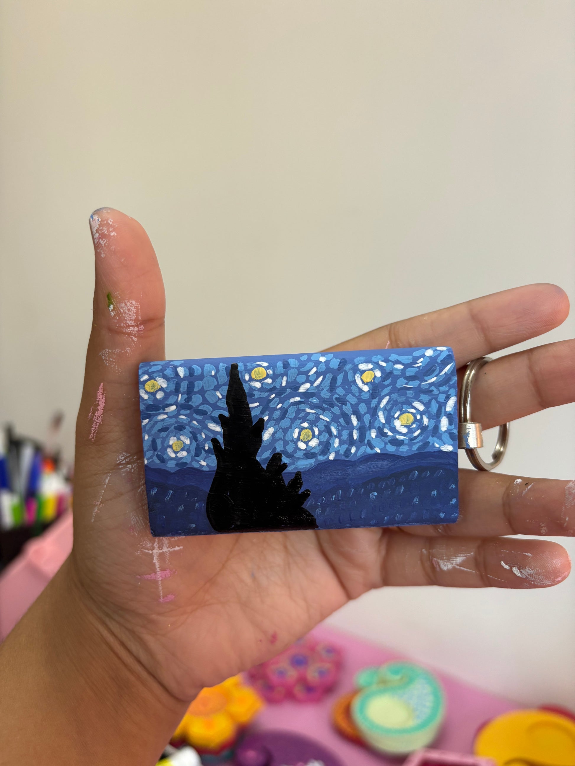 Starry Night is a hand-painted keychain inspired by the iconic swirls and strokes of The Starry Night. Dotted in deep blues and scattered stars, this miniature piece of art is a pocket-sized tribute to wonder, whimsy, and wandering thoughts.