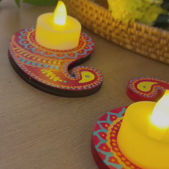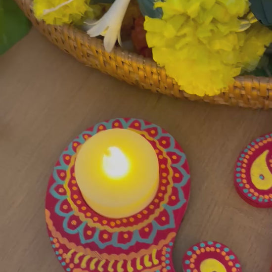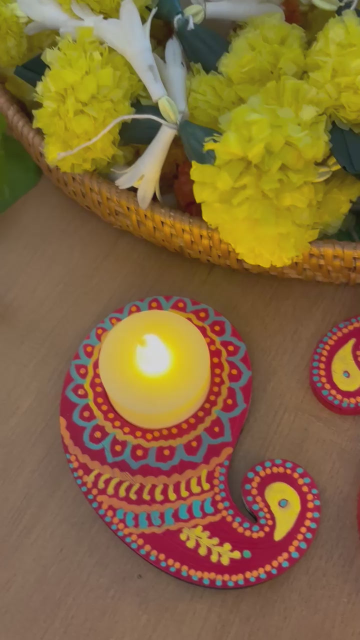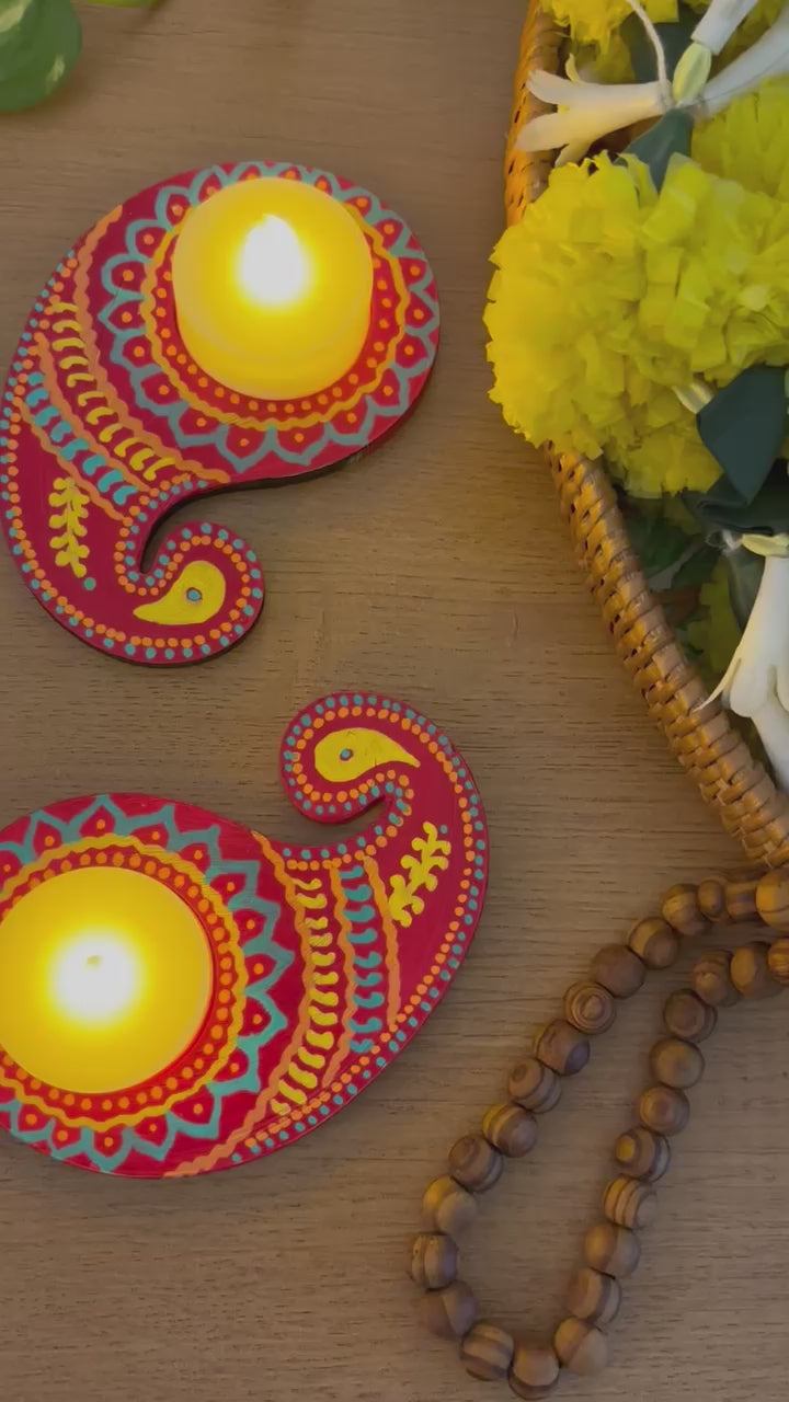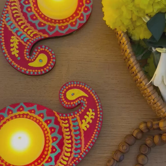 Add a touch of handcrafted brilliance to your festive décor with Tejas - a set of paisley-shaped, hand-painted tea light holders that radiate warmth and colour. Intricately designed in vibrant reds, yellows, and blues, these wooden pieces bring a traditional charm that never goes out of style.