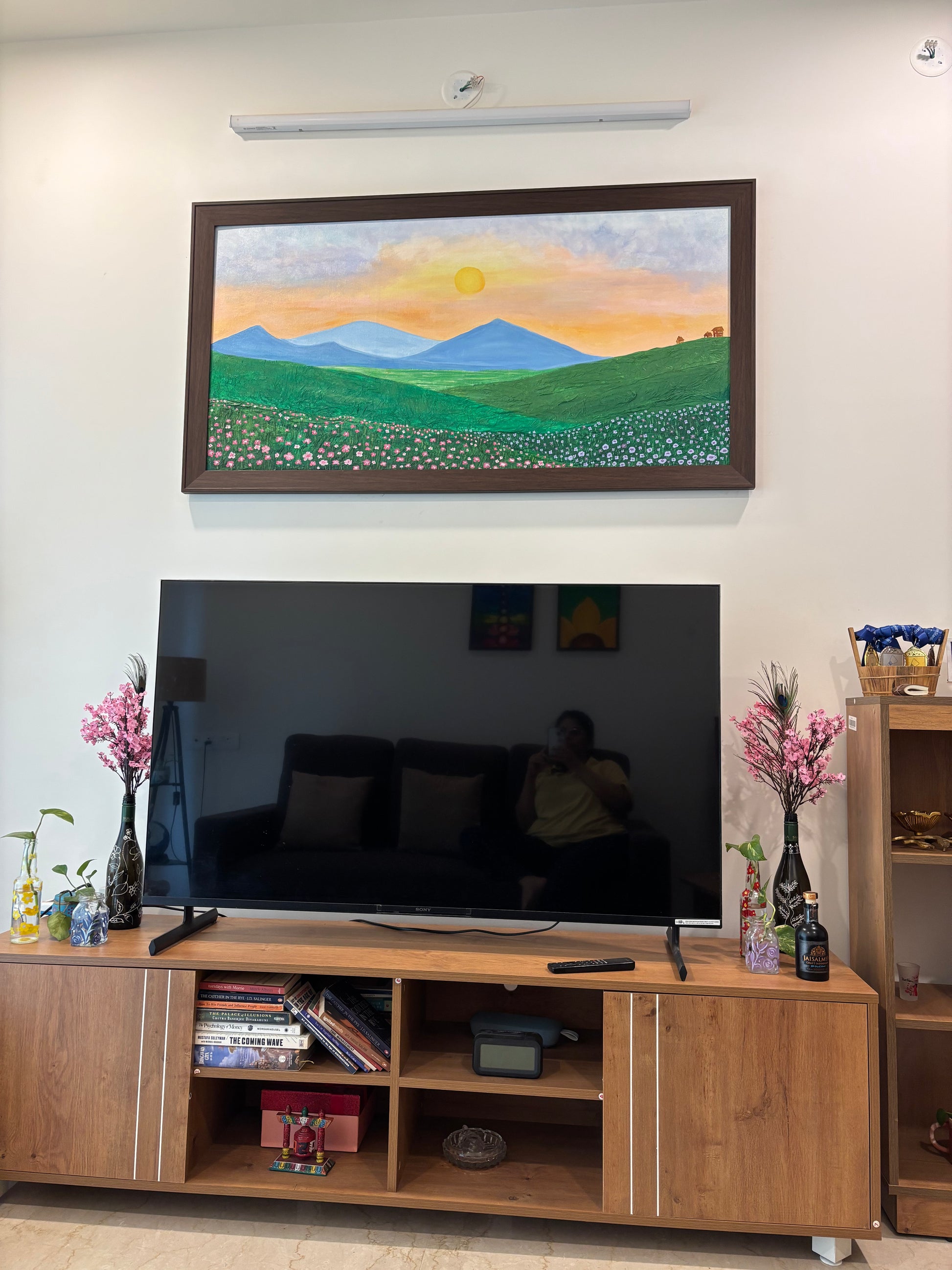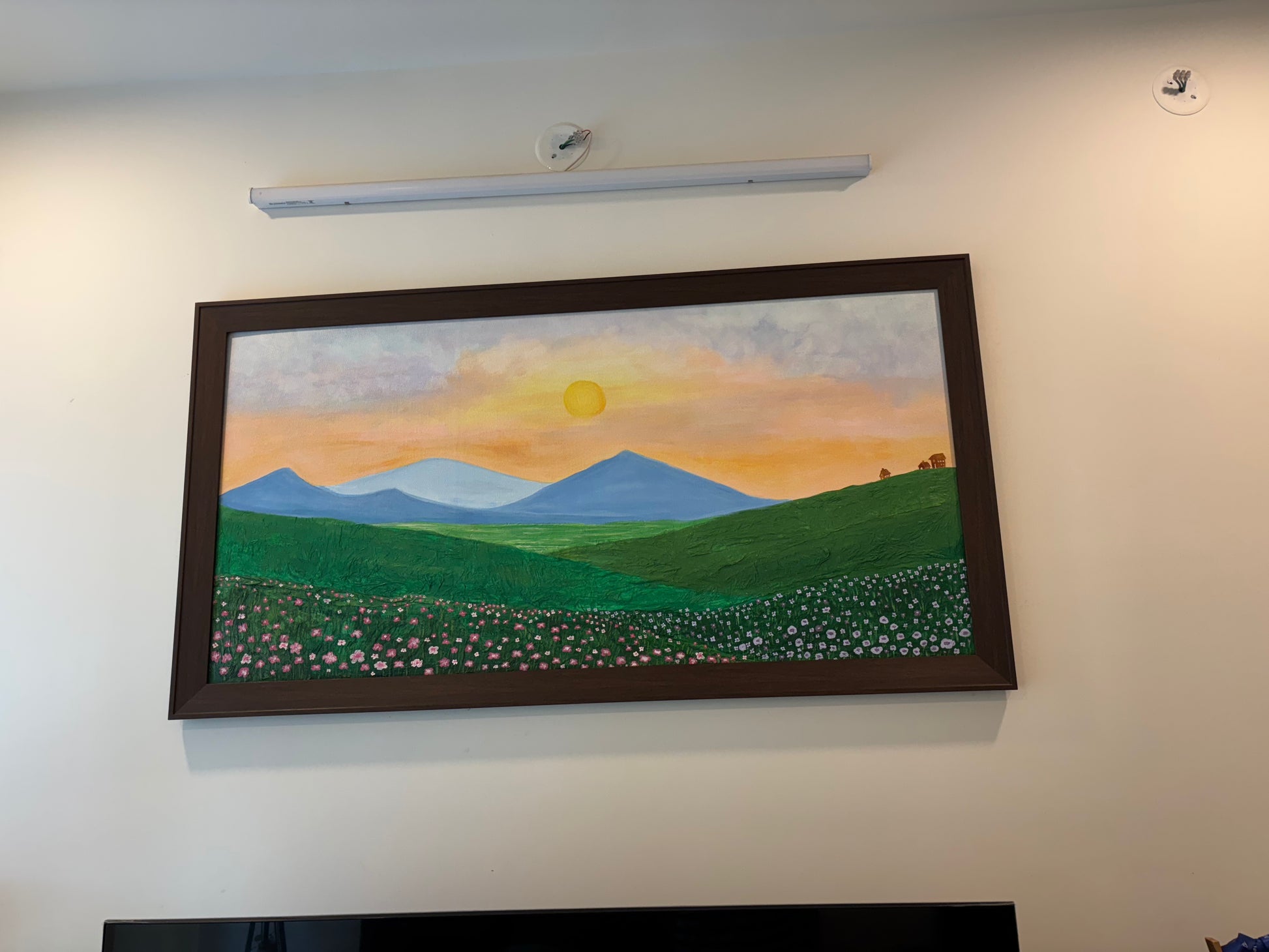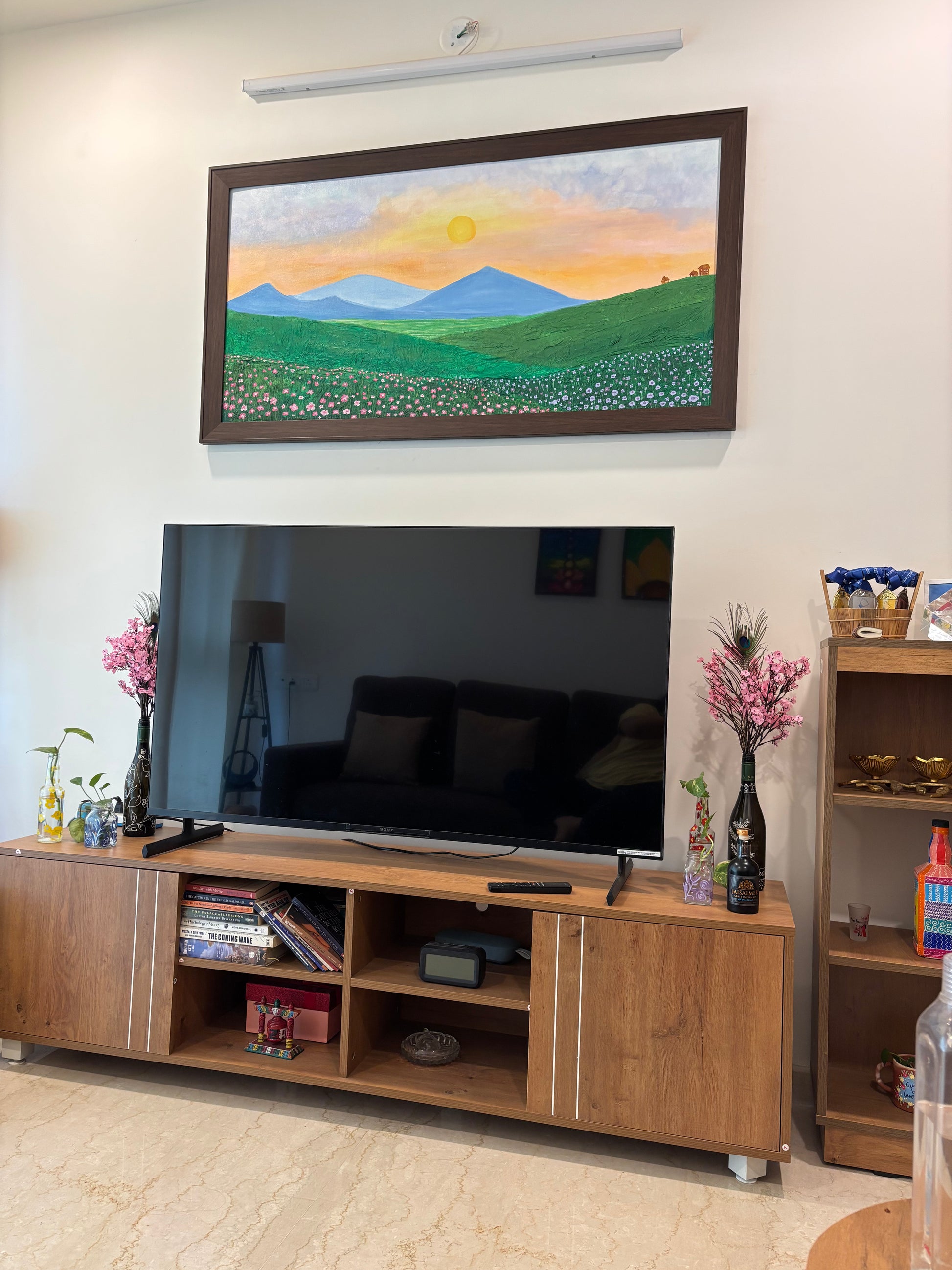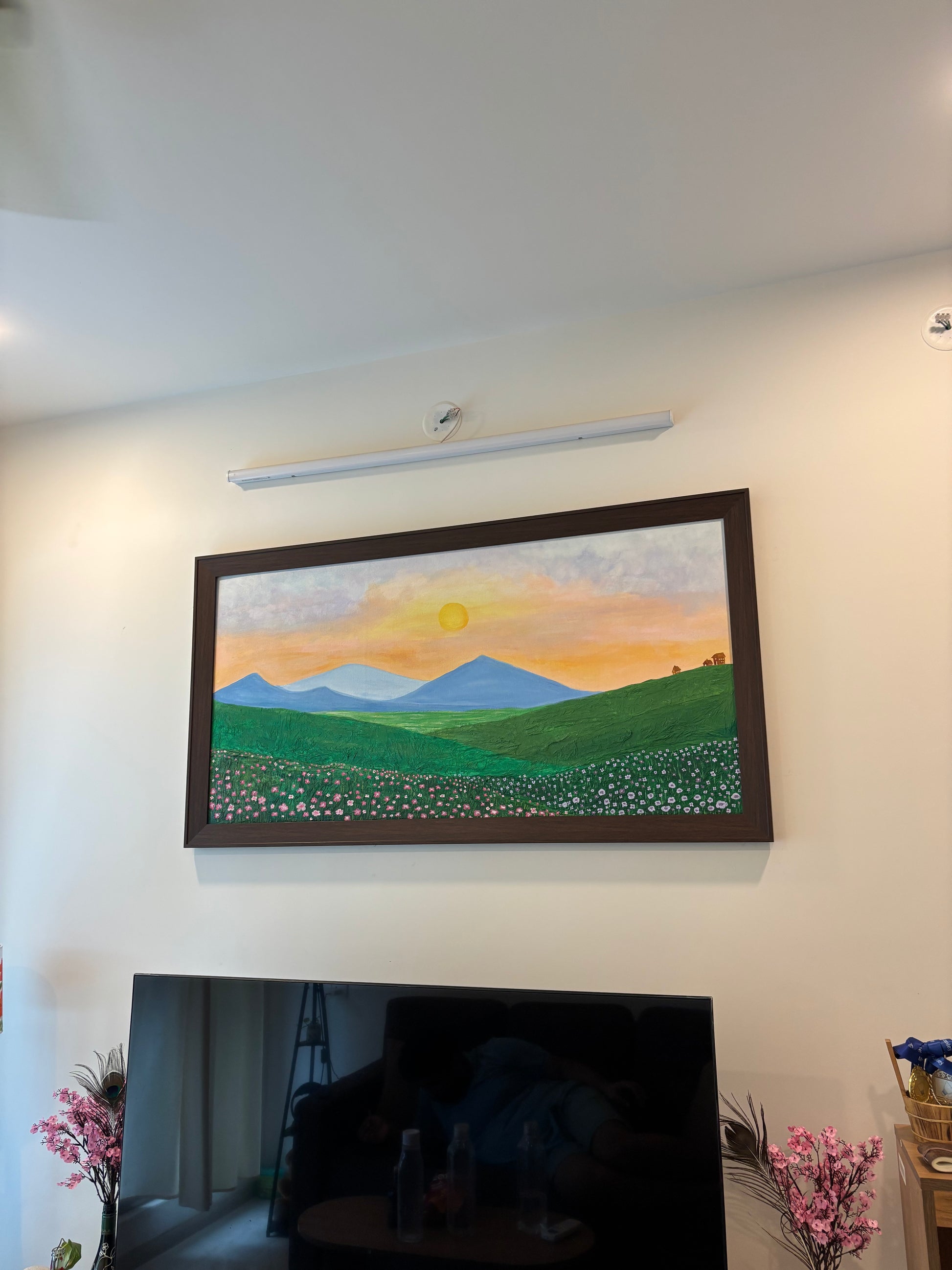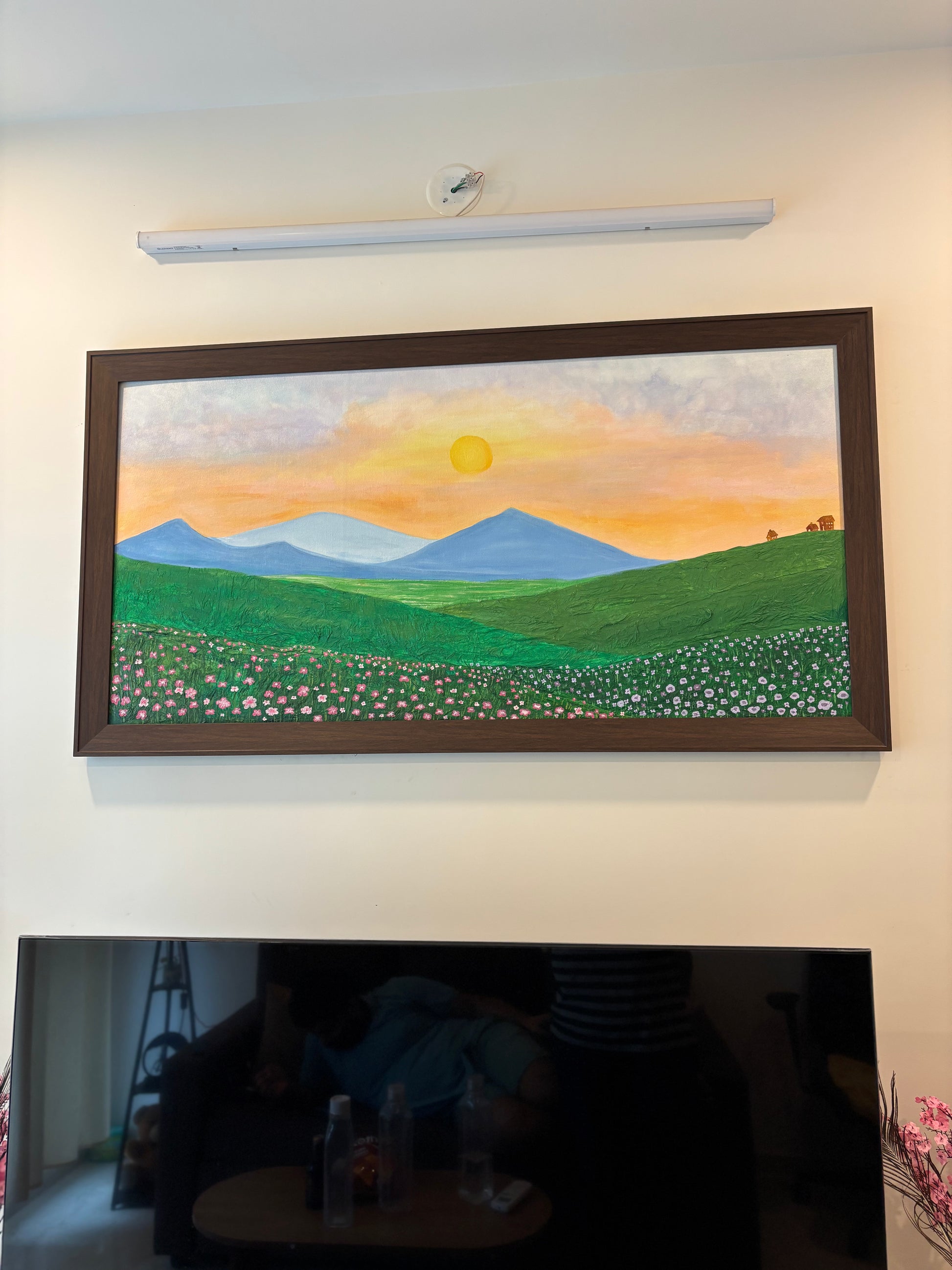 “Whispers of Dawn” is an original acrylic painting enriched with paper mâché textures that make the green meadows come alive. The artwork captures a quiet valley - wildflowers scattered across the field, blue mountains resting in the distance, and a golden sun slowly rising to meet the day.
